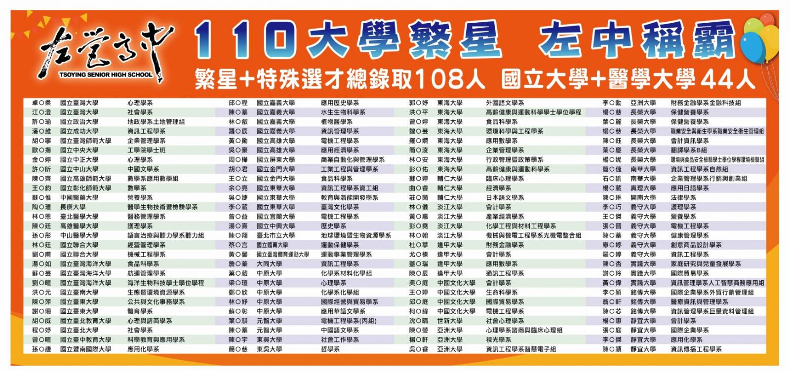 - 110年度大學繁星推薦本校錄取人數108人,南區第一南霸天!錄取名單(請按連結)。