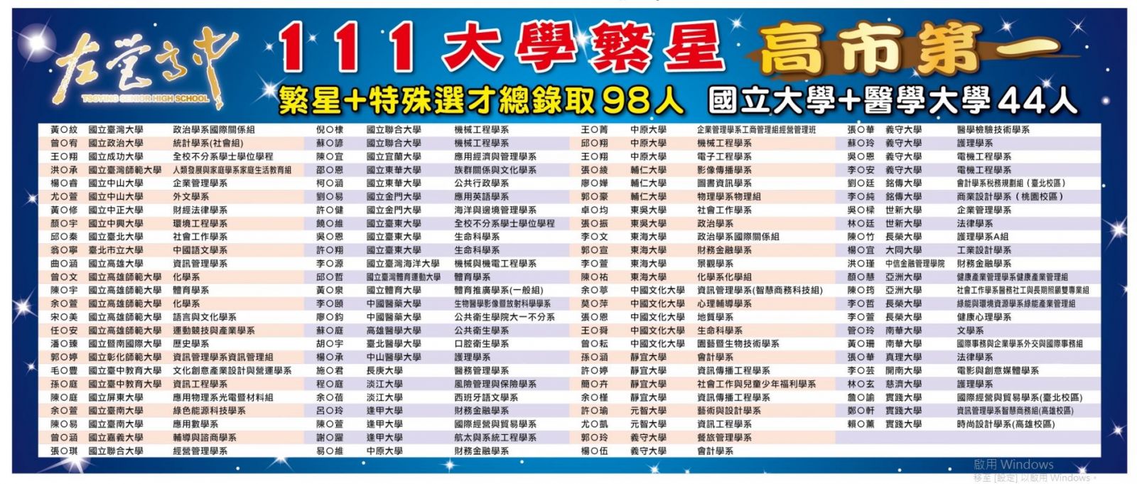 - 111年度大學繁星推薦本校錄取人數93人,高市摘星最多!錄取名單(請按連結)。