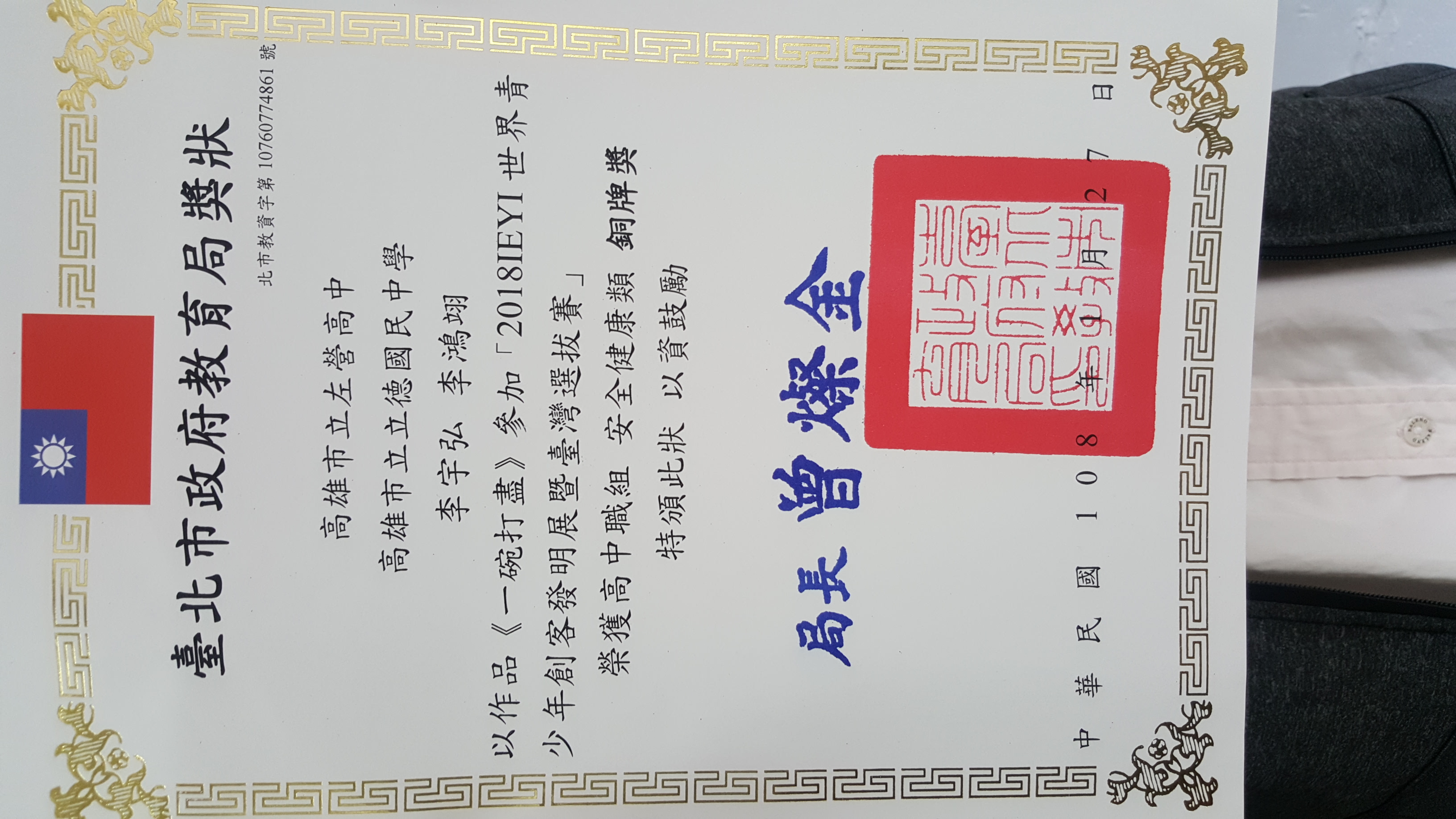2年11班李弘宇同學參加2018IEYI世界青少年創客發明展榮獲高中職組安全健康類銅牌獎