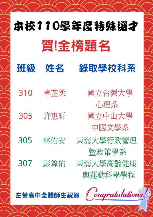 【升學榜單】本校學生參加110學年度學士班特殊選才,榮登金榜!