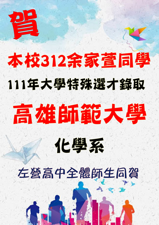 | 2021/12/21 恭賀3年12班余家萱同學透過特殊選才管道錄取高雄師範大學化學系 |