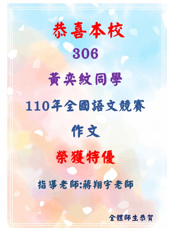 恭賀本校黃奕紋同學榮獲作文比賽高中學生組特優,指導老師蔣翔宇老師