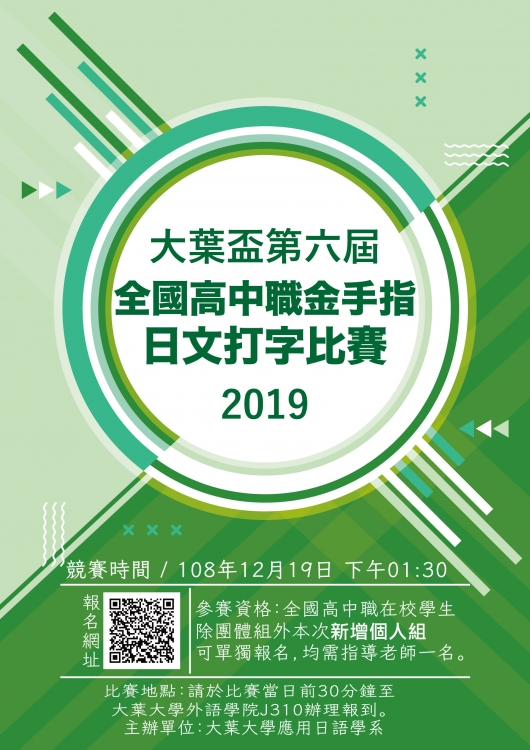 | 2019/12/04 「大葉盃第六屆全國高中職金手指日文打字比賽」資訊 |