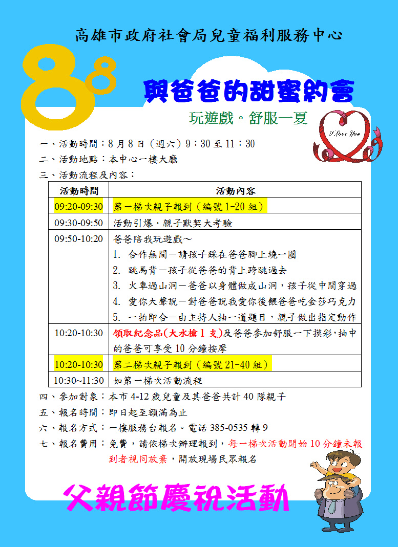 高雄市政府社會局兒童福利服務中心辦理【與爸爸的甜蜜約會】活動,請踴躍參加。