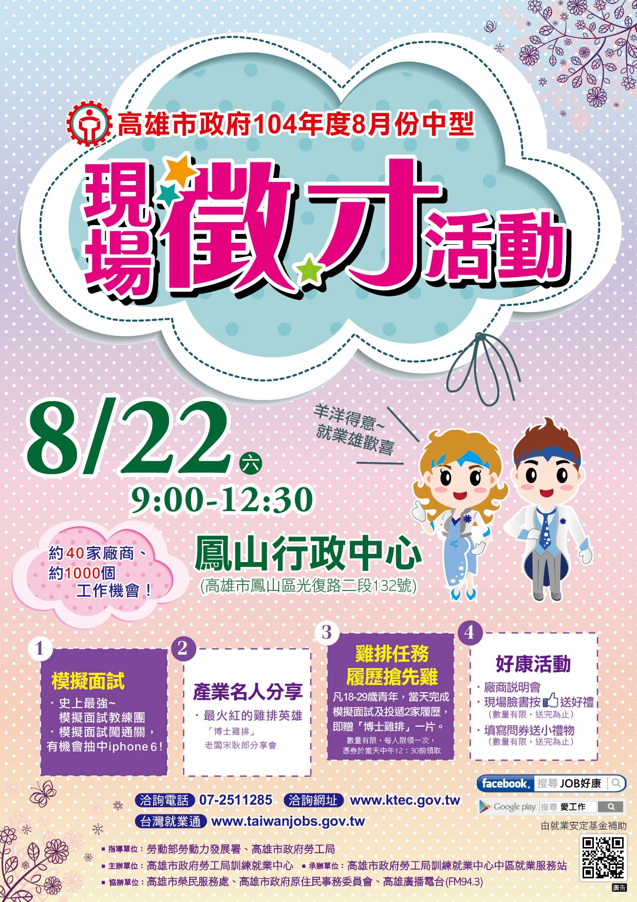 本中心訂於本(104)年8月22日(星期六)上午9時至12時30分假高雄市政府鳳山行政中心1樓大禮堂(高雄市鳳山區光復路二段132號)辦理「羊洋得意 就業雄歡喜」8月份中型現場徵才活動,請貴校惠予協助於學校網站首頁及跑馬燈系統刊登活動訊息,宣傳週知,俾應屆畢業生、待(失)業校友及待(失)業學生家長等踴躍參加。