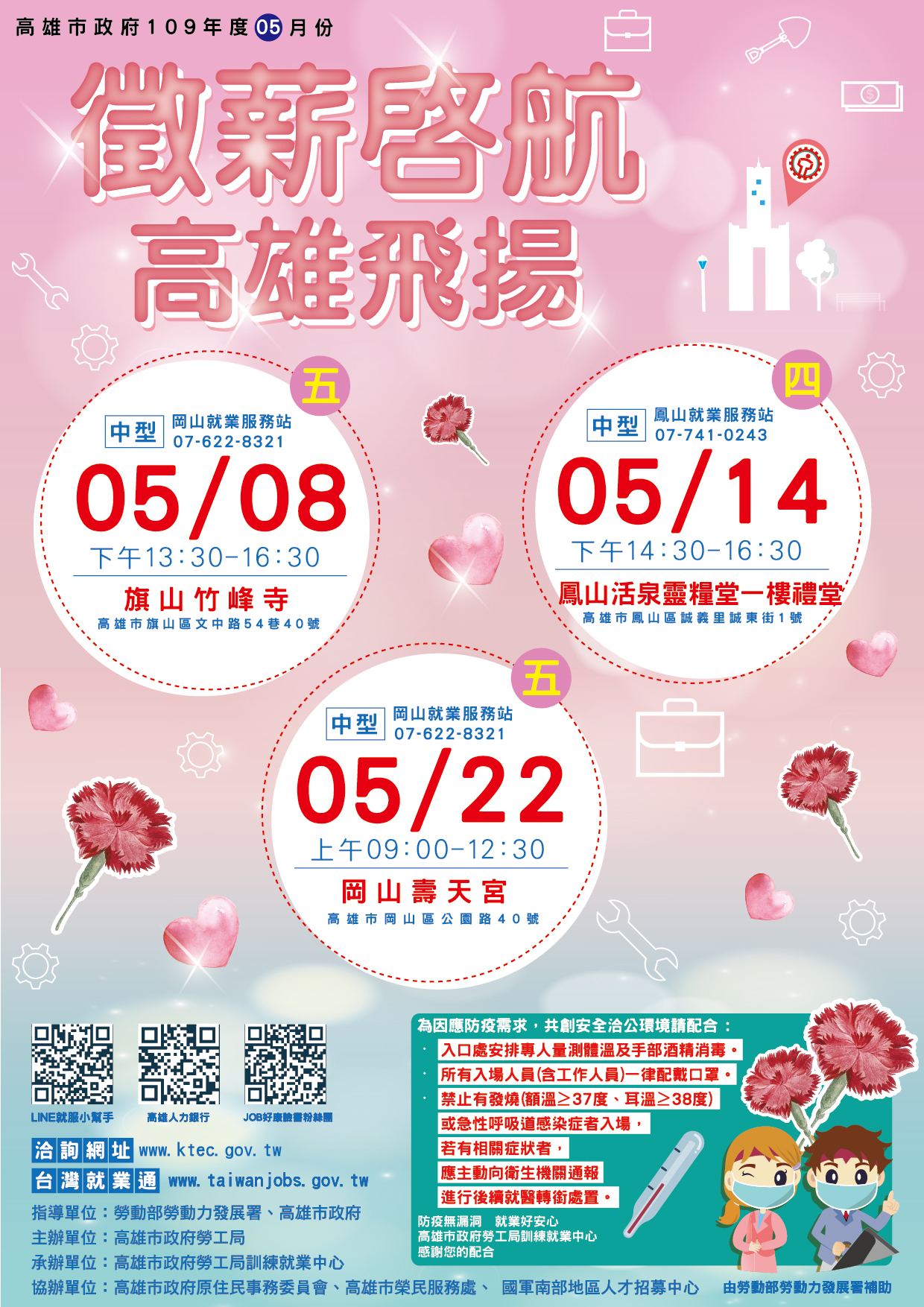 勞工局訓練就業中心訂於5月14日下午14:30-16:30於鳳山活泉靈糧堂1樓禮堂(高雄市鳳山區誠東街1號)、5月22日上午09:00-12:30於岡山壽天宮(高雄市岡山區公園路40號),辦理2場次中型現場徵才活動。歡迎有求職需求的市民朋友們,踴躍前往參加,詳細活動訊息請至高雄人力銀行網頁(https://app.ktec.gov.tw)查詢或洽各就業服務站