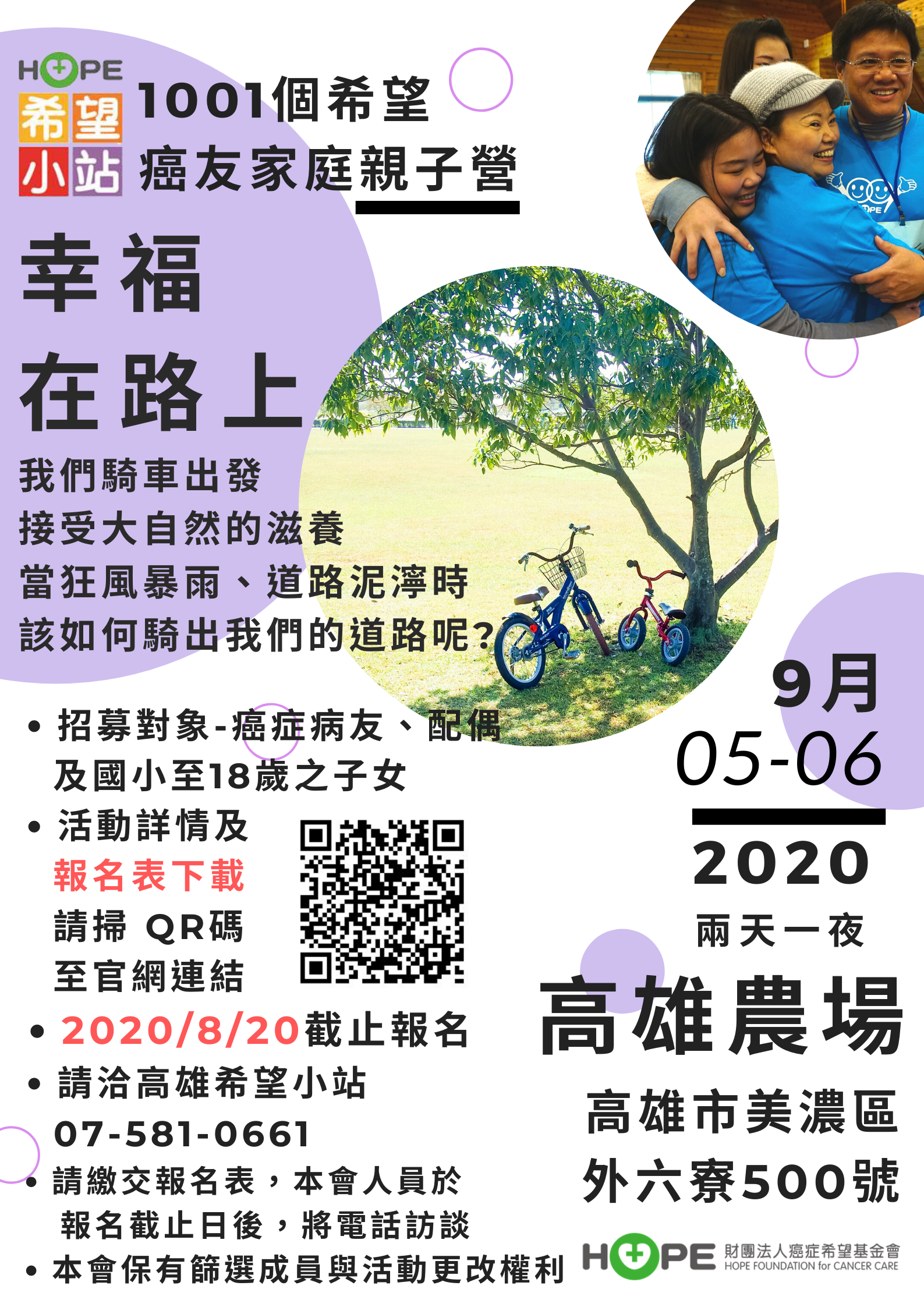 三、本活動訂於2020/09/5-9/6在高雄農場辦理,相關活動詳情請至本會官網(https://www.ecancer.org.tw)查詢,可採下列任一方式繳交報名表: