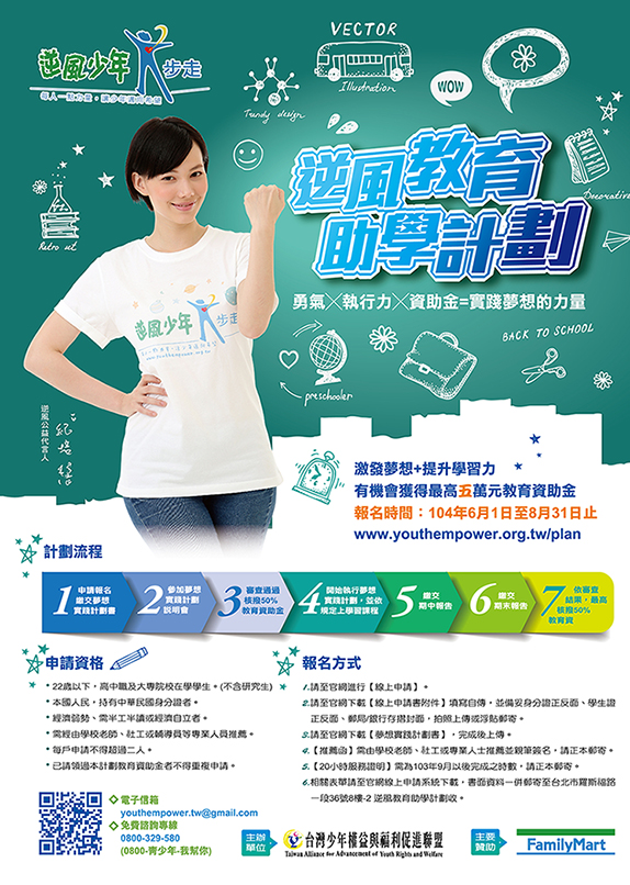 | 2015/08/21 社團法人台灣少年權益與福利促進聯盟「104學年度逆風教育助學計畫」活動訊息 |