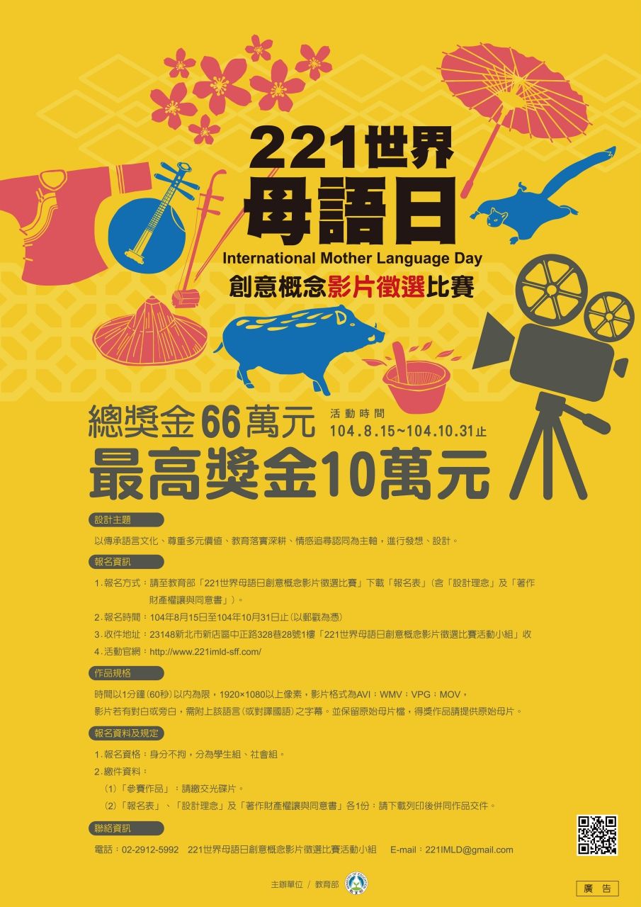 | 2015/08/24 教育部辦理「221世界母語日創意概念影片徵選比賽」 |