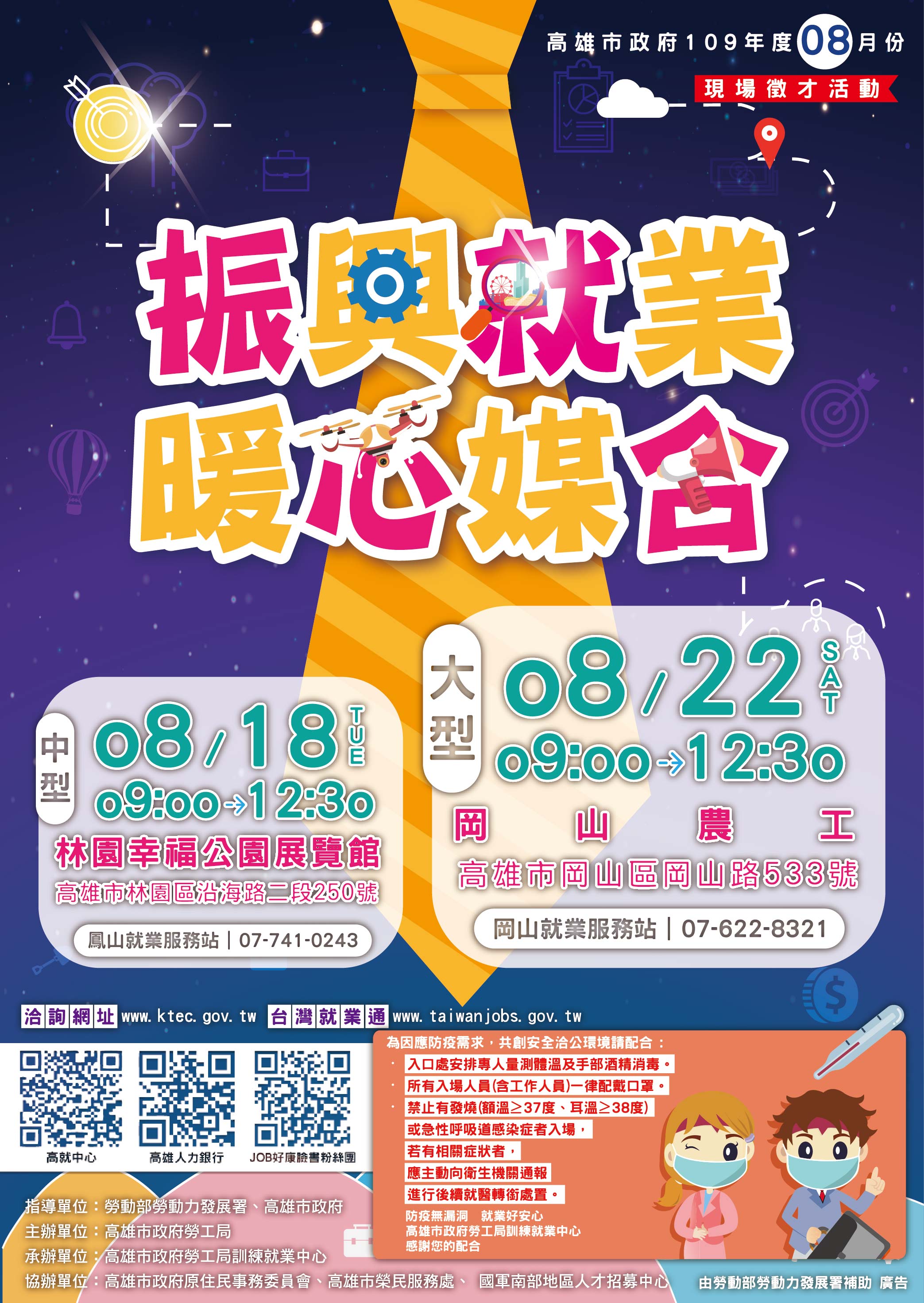| 2020/07/28 轉知高雄市政府勞工局訓練就業中心辦理『振興就業 暖心媒合』8月份中大型現場徵才活動 |