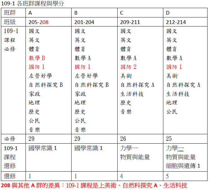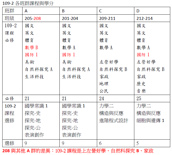 以下為109學年度各班群高二上和高二下之必修與選修學分課程名稱,供參考