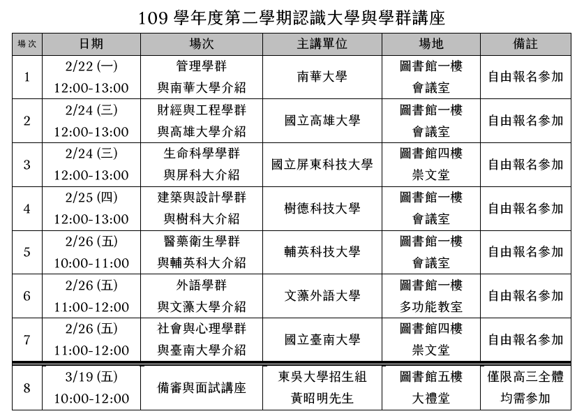 - 以上各場講座除3/19為僅限高三全體(含繁星上榜生與決定要指考生)均須參加外,其他場次均開放讓高一至高三同學參加。