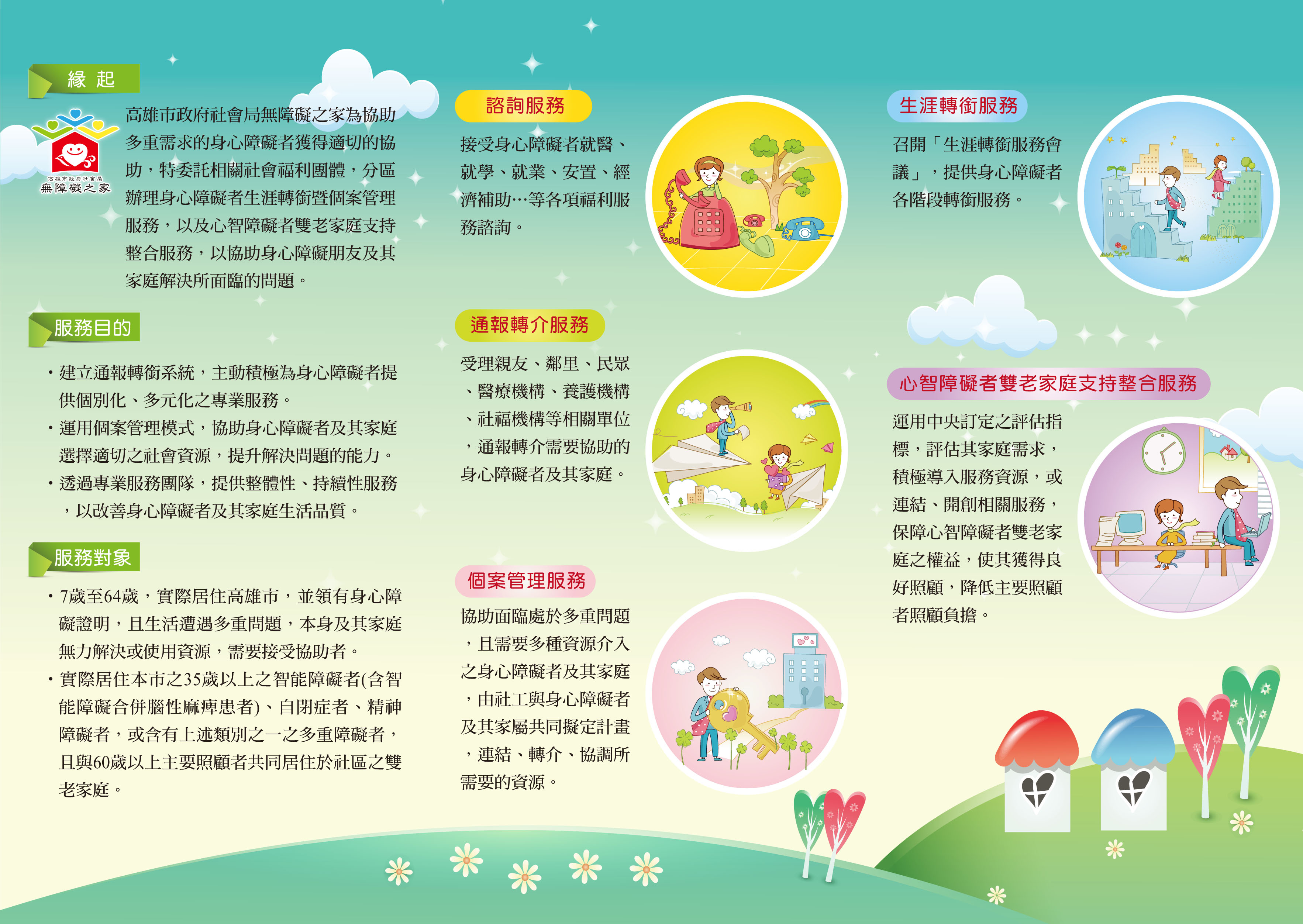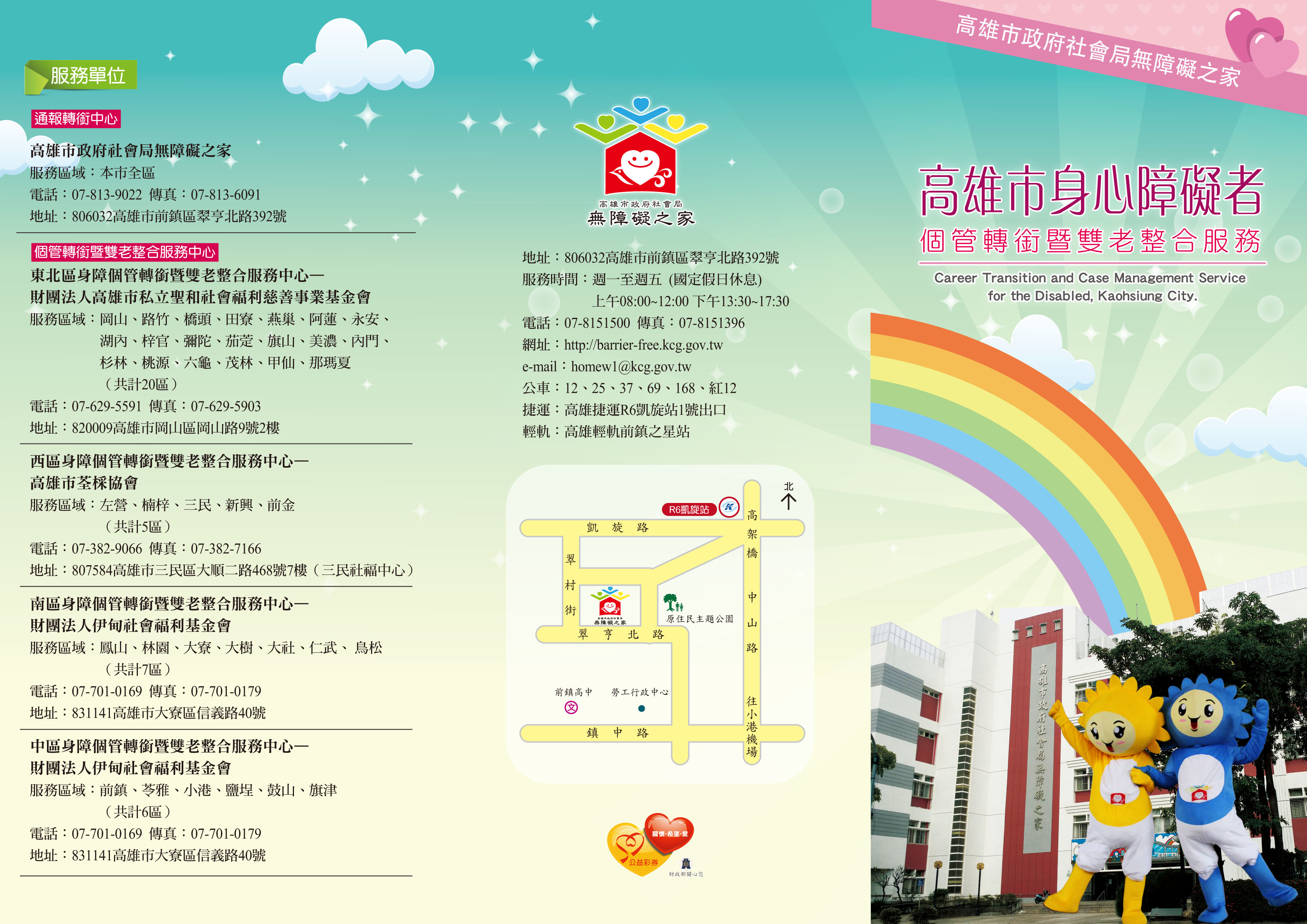 二、本府社會局無障礙之家原辦理「身心障礙者個案管理暨生 涯轉銜服務」,另該局身心障礙科原辦理「心智障礙者雙老家庭服務」,自110年起整併為「身心障礙者個管轉銜暨 雙老整合服務」,由本府社會局無障礙之家為單一窗口, 服務專線電話:07-8139022。