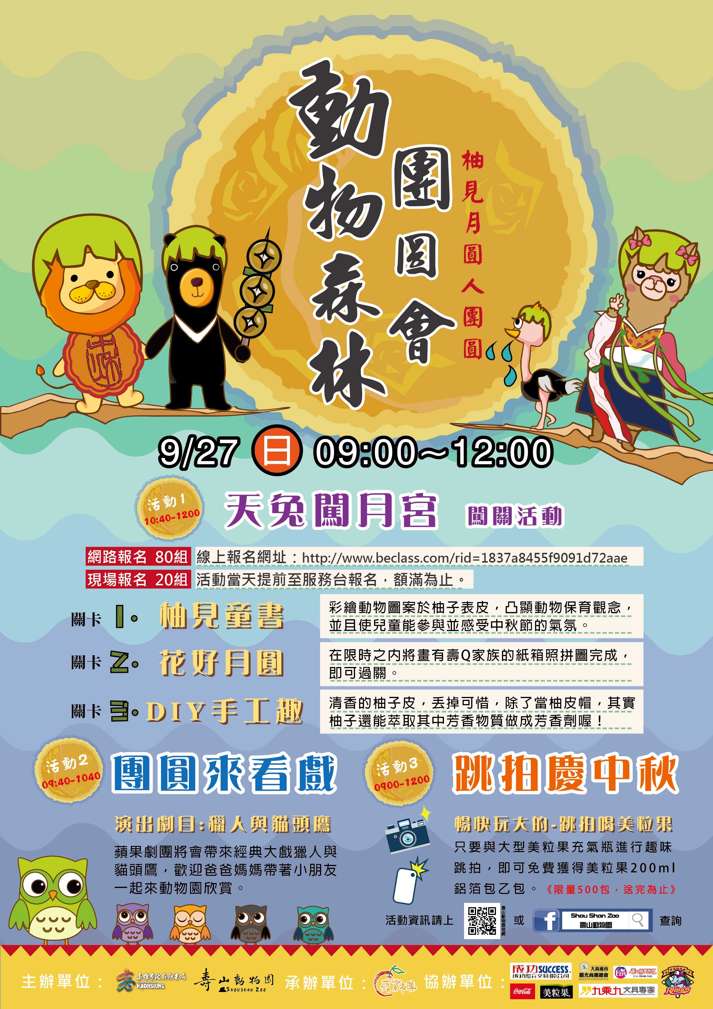 | 2015/09/21 壽山動物園舉辦「動物森林團圓會 柚見月圓人團圓」中秋節教育推廣活動,請踴躍參加。 |