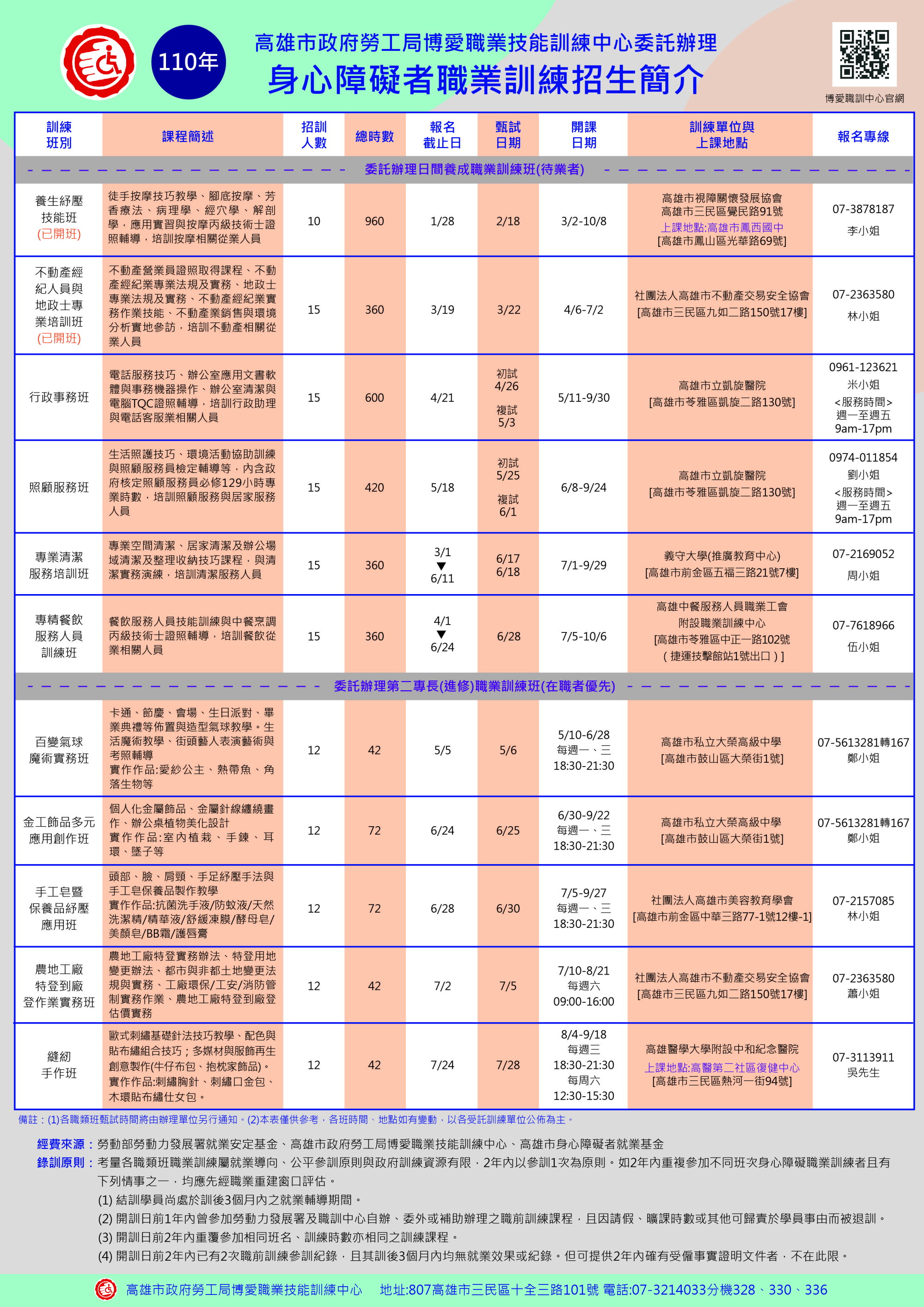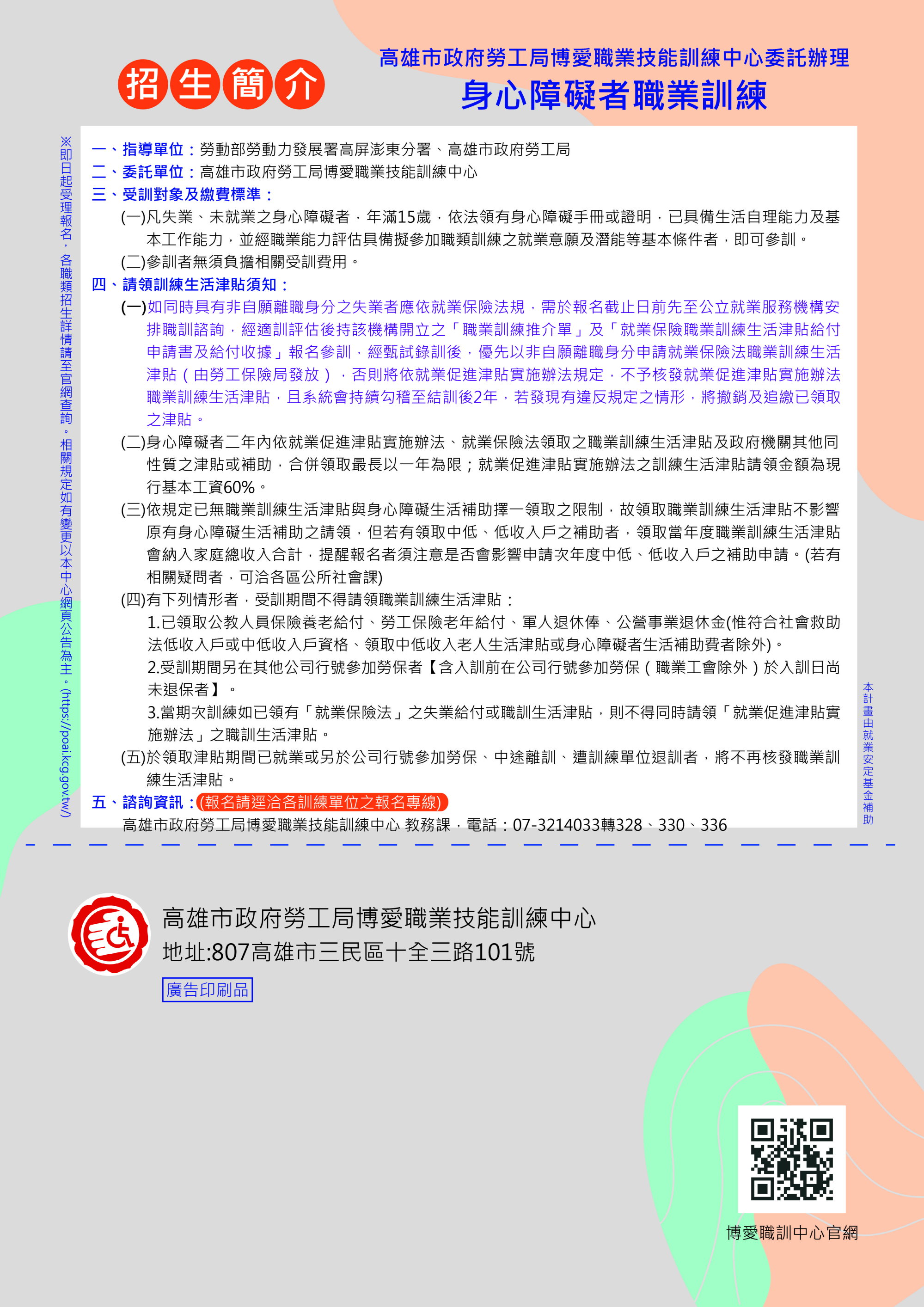 詳細招生訊息請洽詢各訓練單位或至高雄市政勞工局博愛