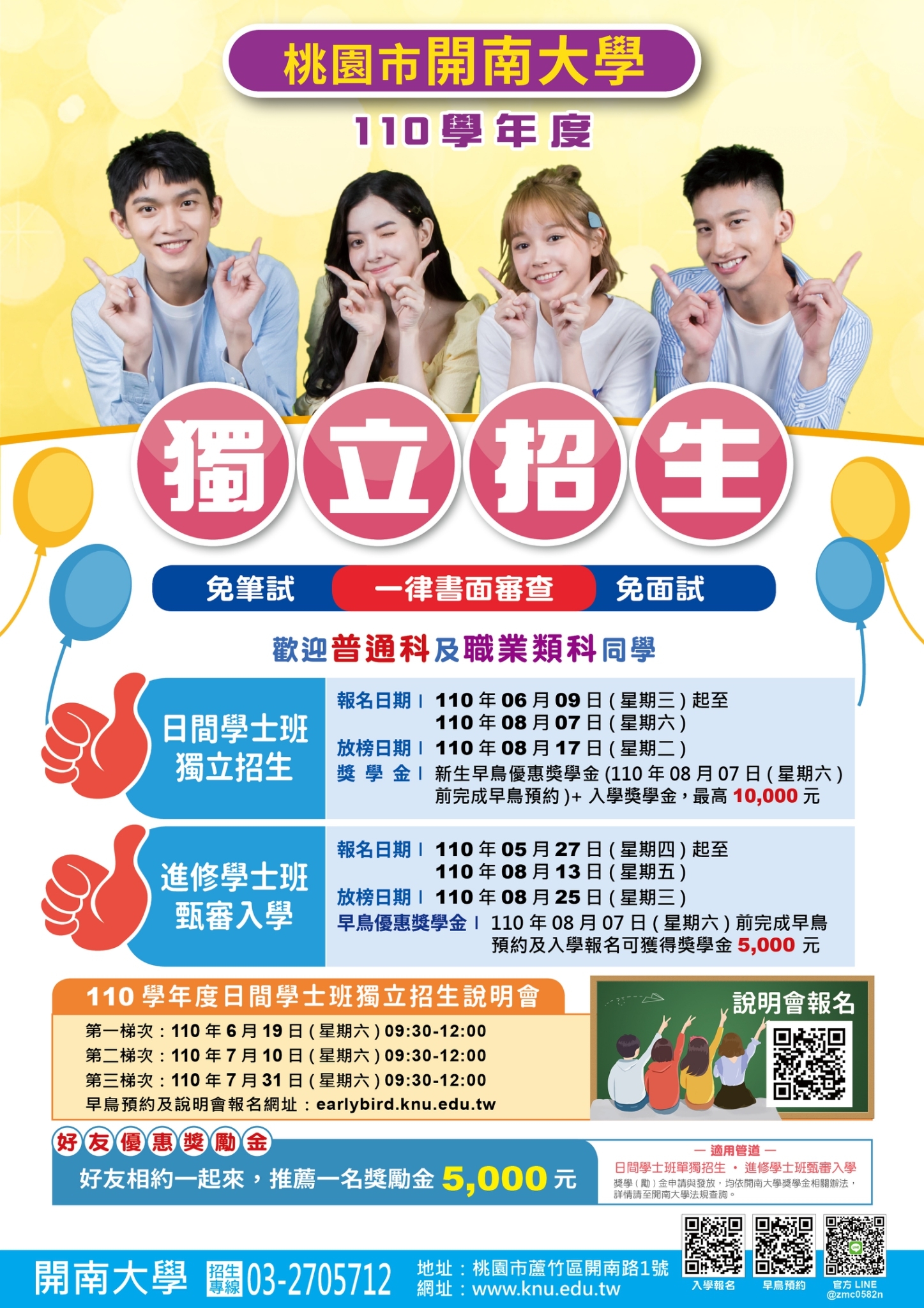 開南大學110學年度日間學士班單獨招生暨進修學士班甄審入學招生訊息