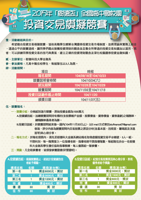 樹德科技大學將於104/9/18(六)~104/11/27(五)舉辦「2015年『樹德盃』全國高中職校園投資交易模擬競賽」,歡迎學生踴躍參加。