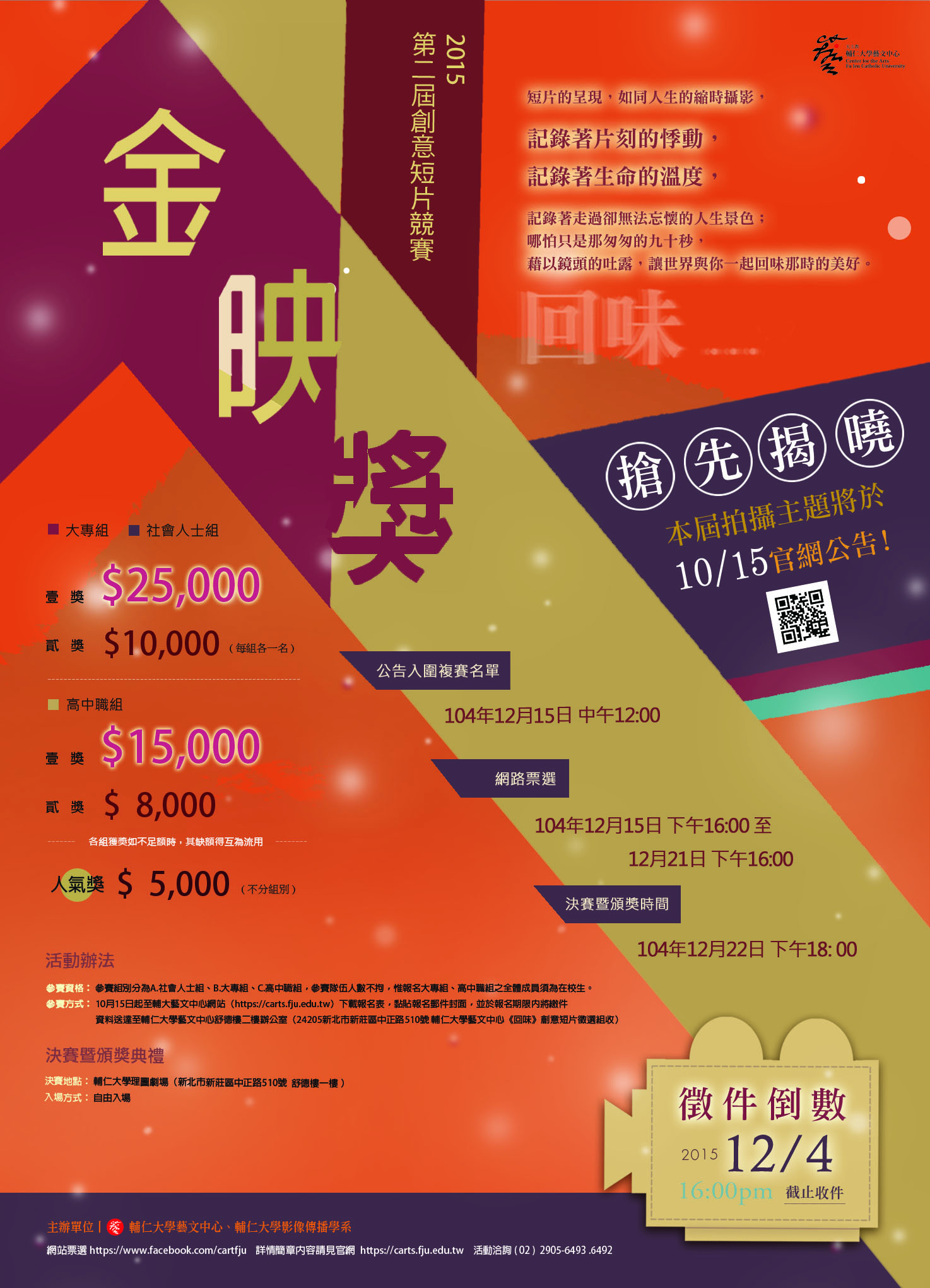 | 2015/10/05 輔仁大學舉辦「2015第二屆金映獎創意短片競賽《回味》」,歡迎同學組隊參加。 |
