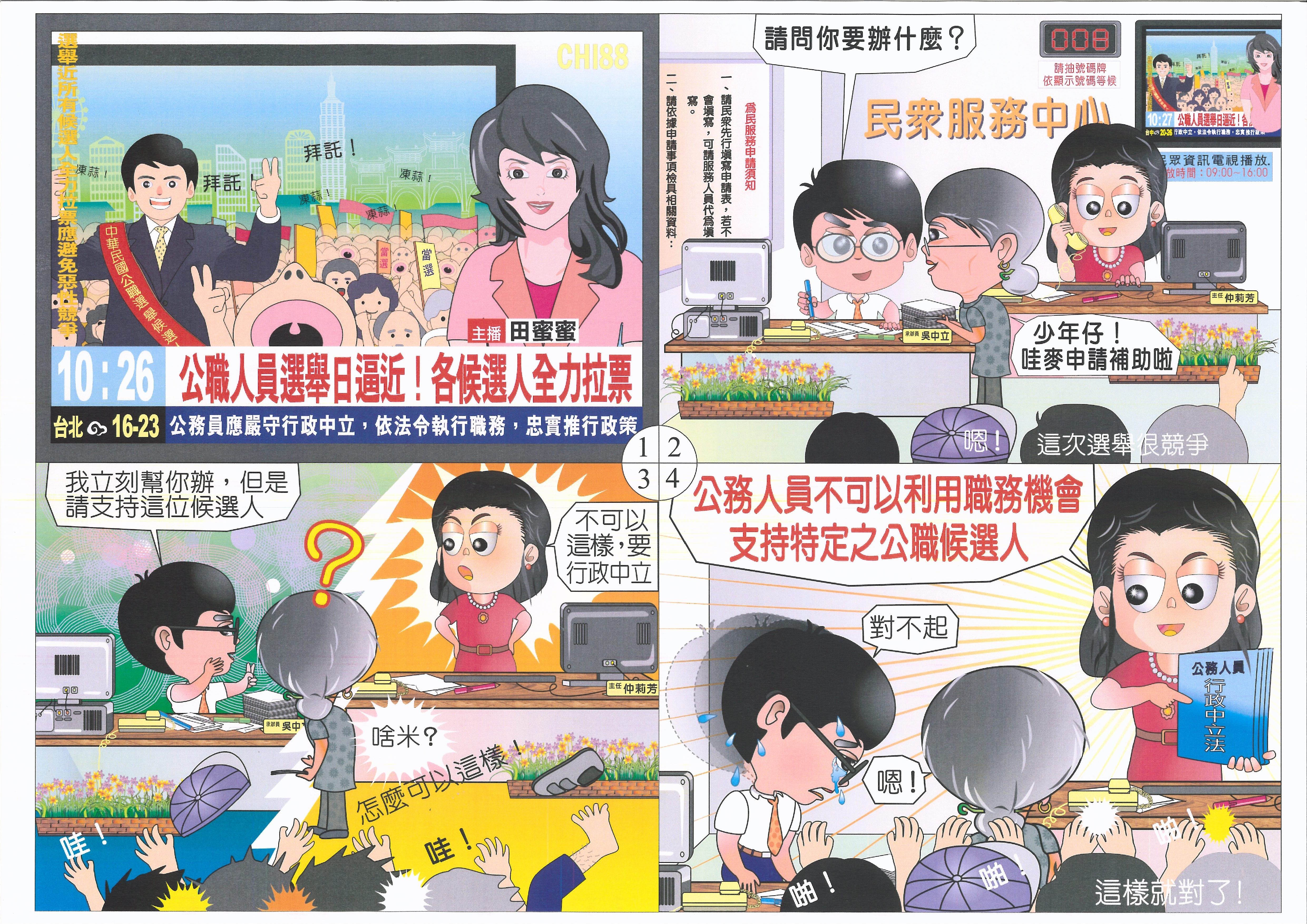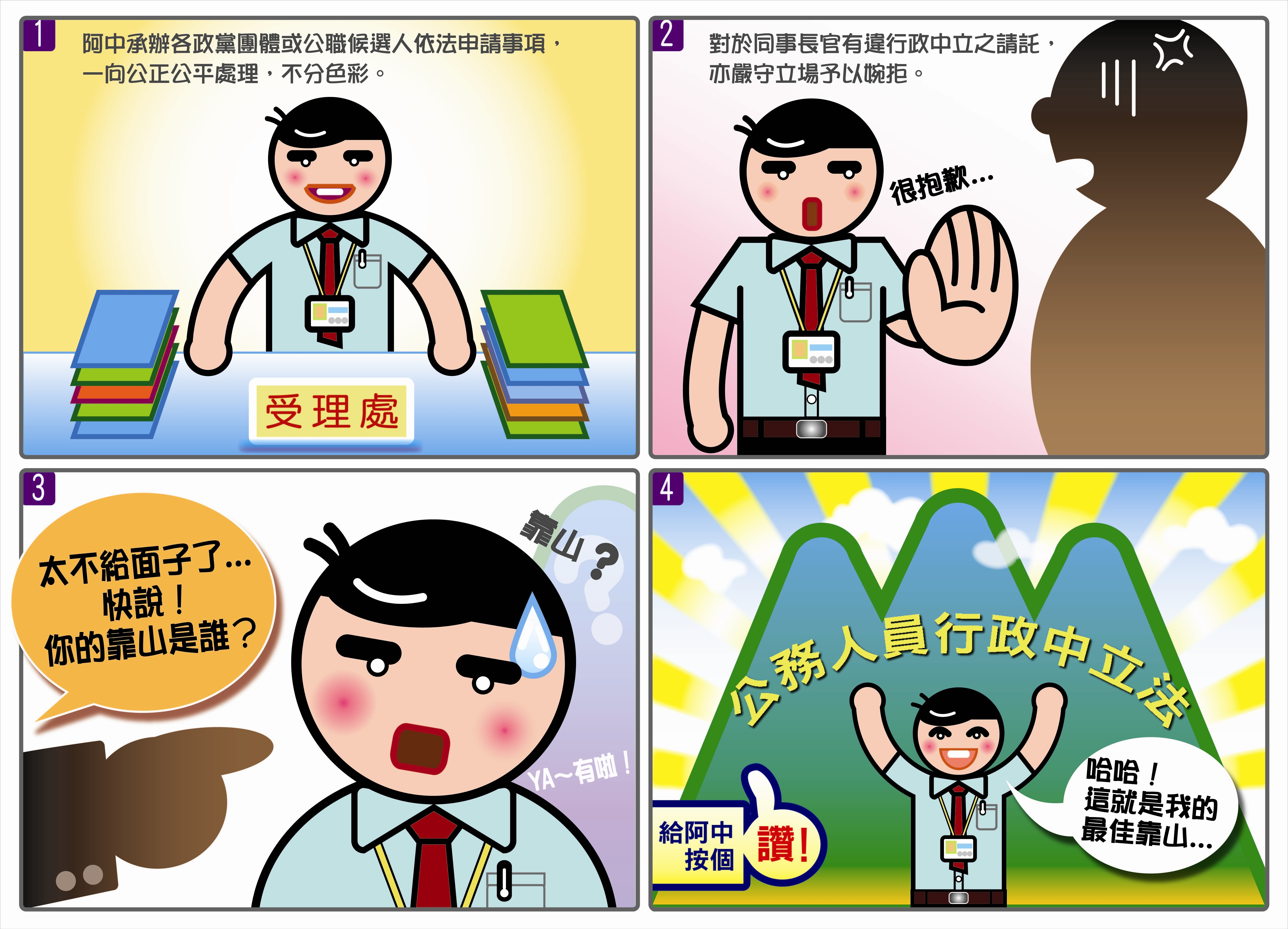 (1)「不分顏色,不分黨派,行政中立在於心中的那把公正尺。考試院公務人員保障暨培訓委員會提醒您。」