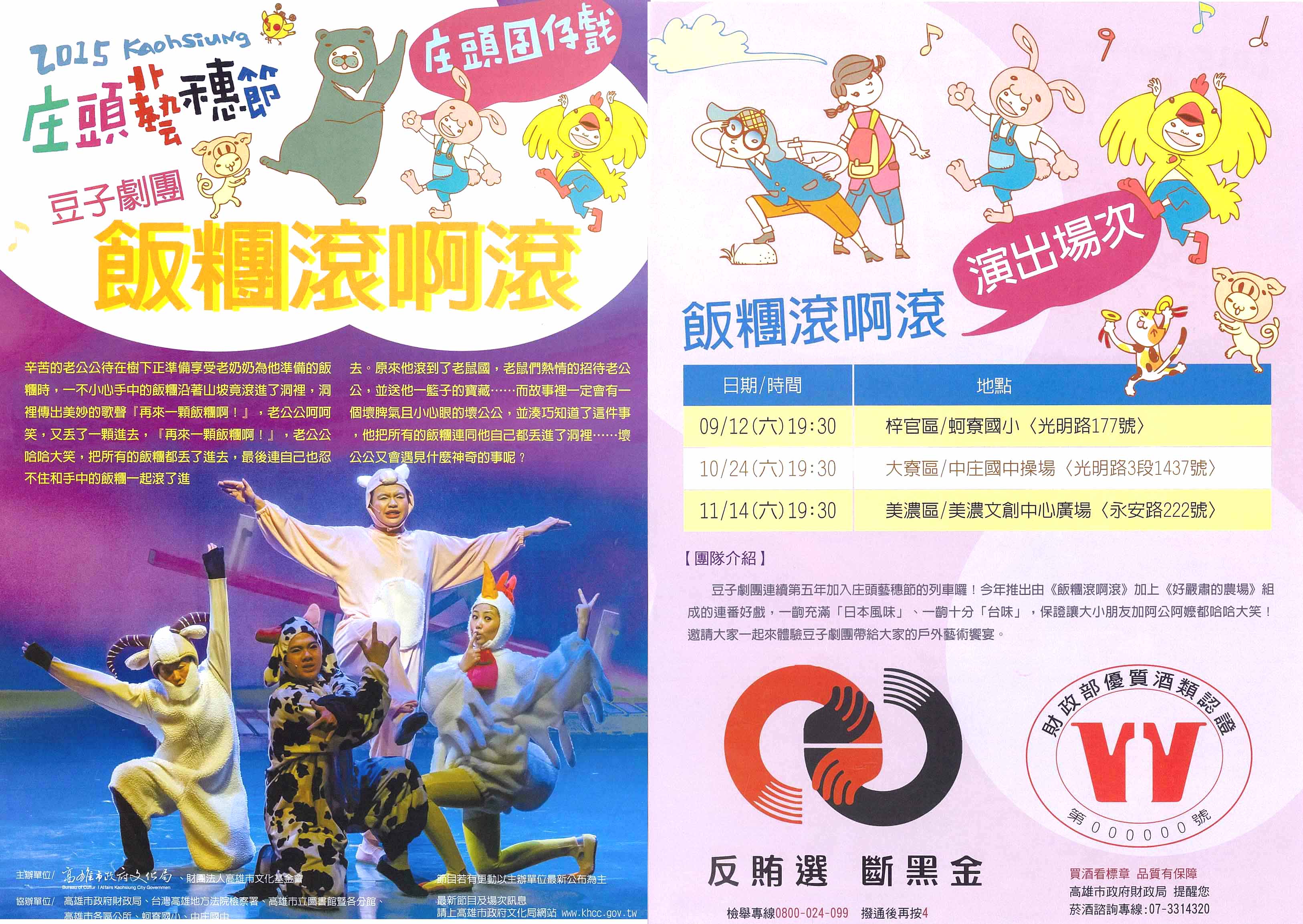 | 2015/10/13 高雄市政府文化局暨財團法人高雄市文化基金會辦理庄頭囝仔戲《飯糰滾啊滾》,請踴躍參加。 |