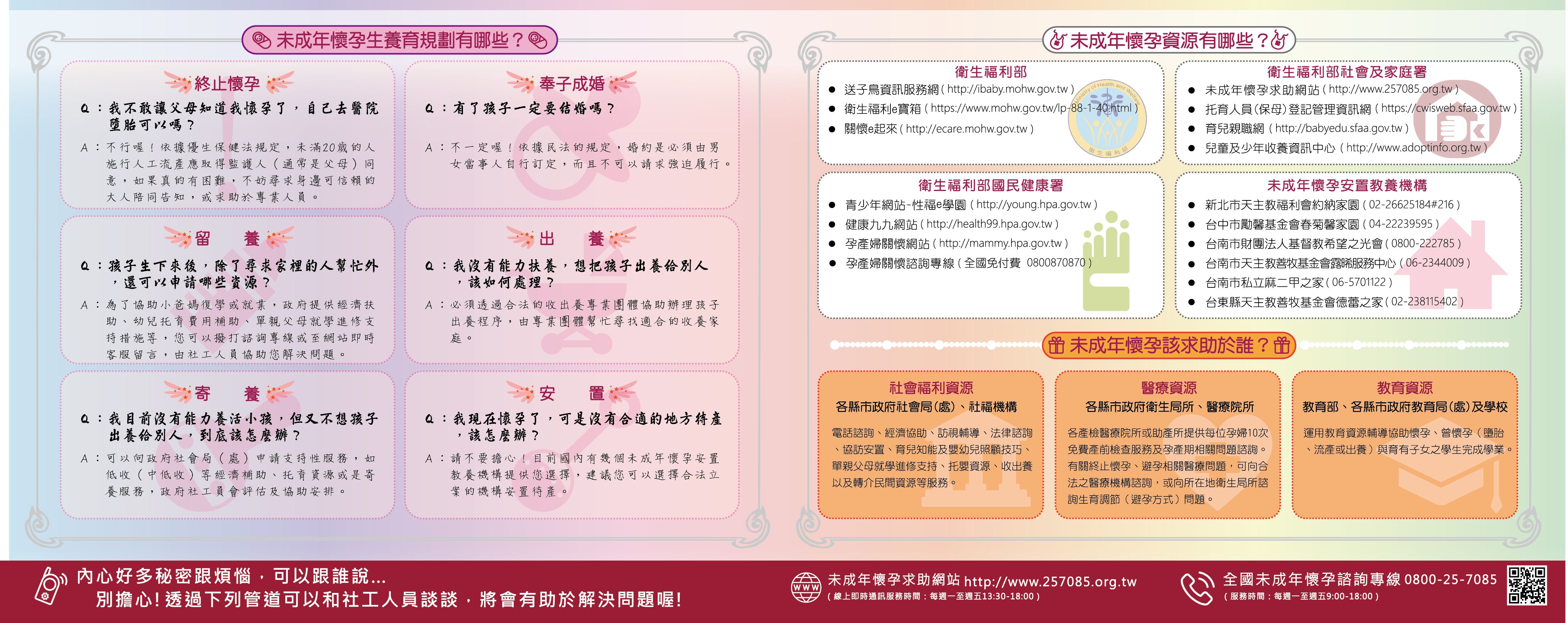 「全國未成年懷孕諮詢專線」(0800- 257085)及「未成年懷孕求助網站」(https://257085. sfaa.gov.tw/),