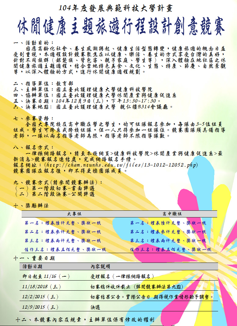| 2015/10/14 國立臺北護理健康大學辦理「休閒健康主題旅遊行程設計創意競賽」,請踴躍參加。 |