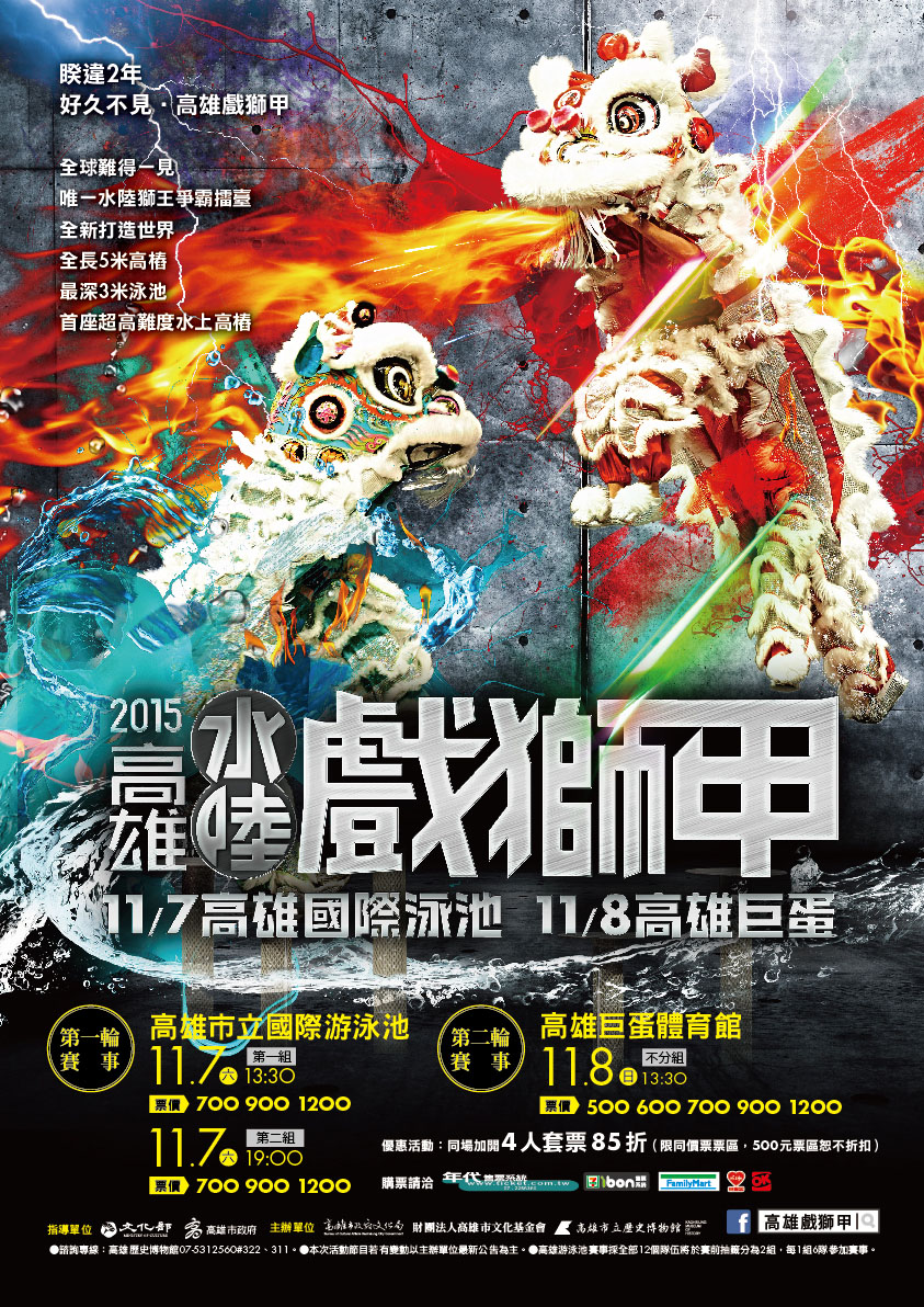 一、本活動於11月7日高雄市立國際游泳池及11月8日高雄巨蛋兩地辦理世界首次水陸雙舞獅擂
