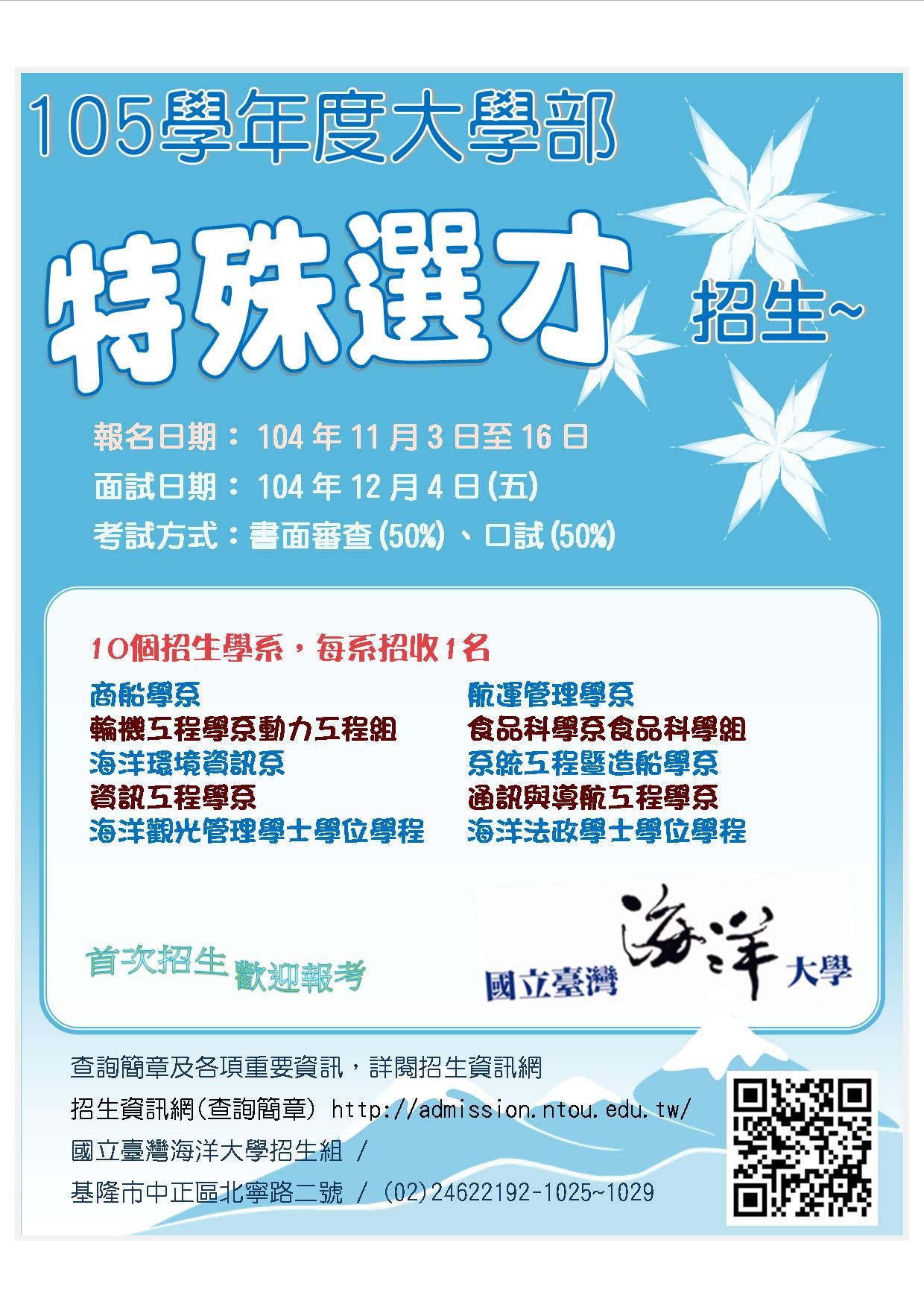 | 2015/10/22 國立臺灣海洋大學105學年度大學部特殊選才招生考試相關資訊 |