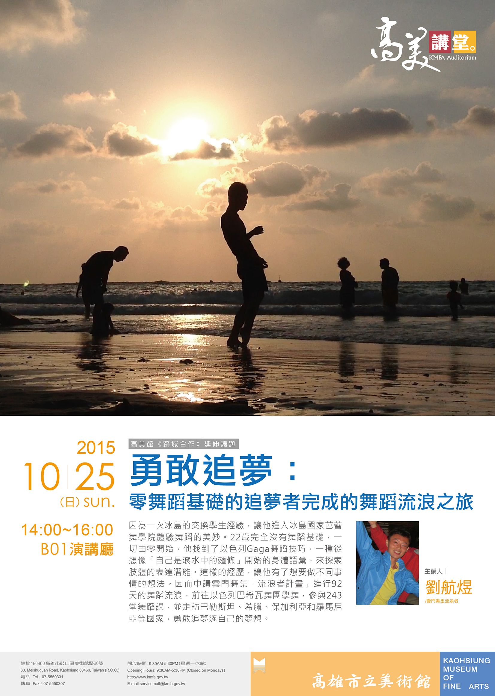 | 2015/10/22 轉知高雄市立美術館「勇敢追夢:零舞蹈基礎的追夢者完成的舞蹈流浪之旅」,歡迎參加。 |