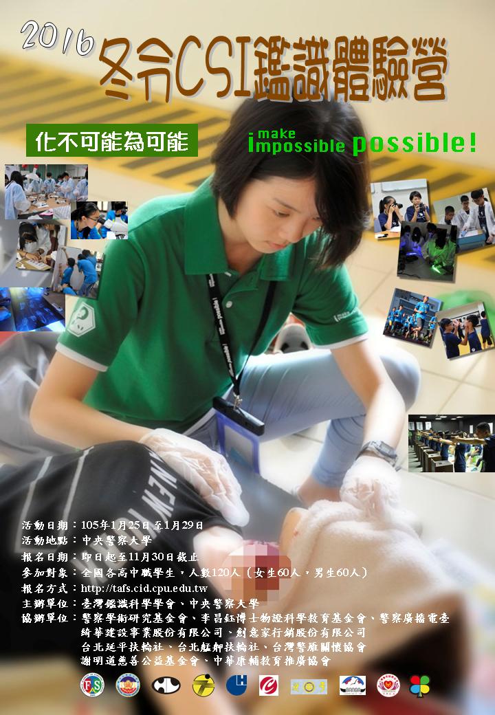 | 2015/10/30 臺灣鑑識科學學會與中央警察大學謹共同舉辦「2016冬令CSI鑑識體驗營」,請踴躍參加。 |