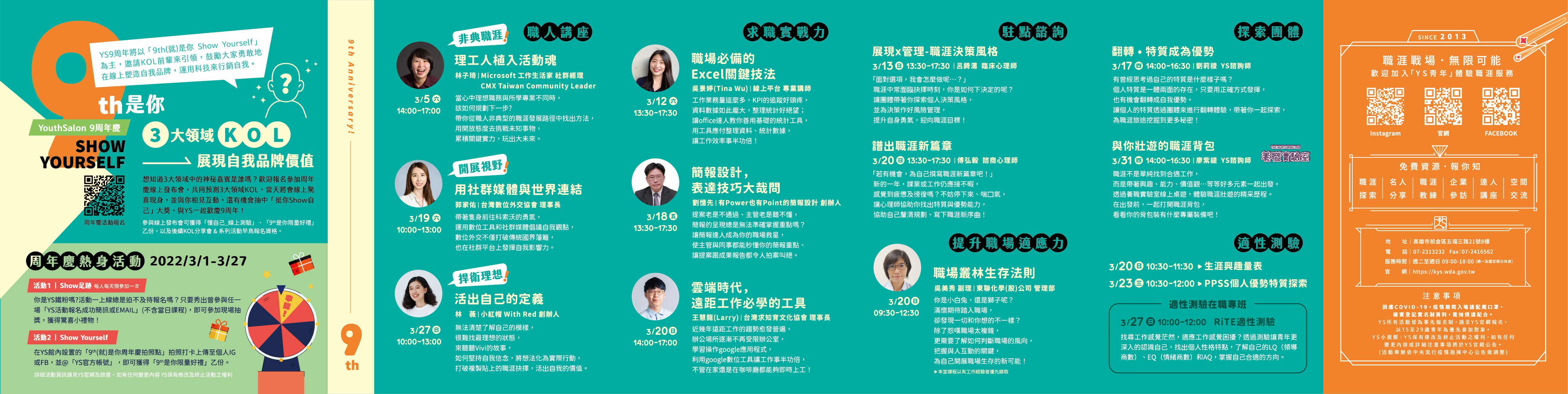 勞動部勞動力發展署高屏澎東分署「青年職涯發展中心」(Youth Salon,以下簡稱YS)111年3月活動DM。