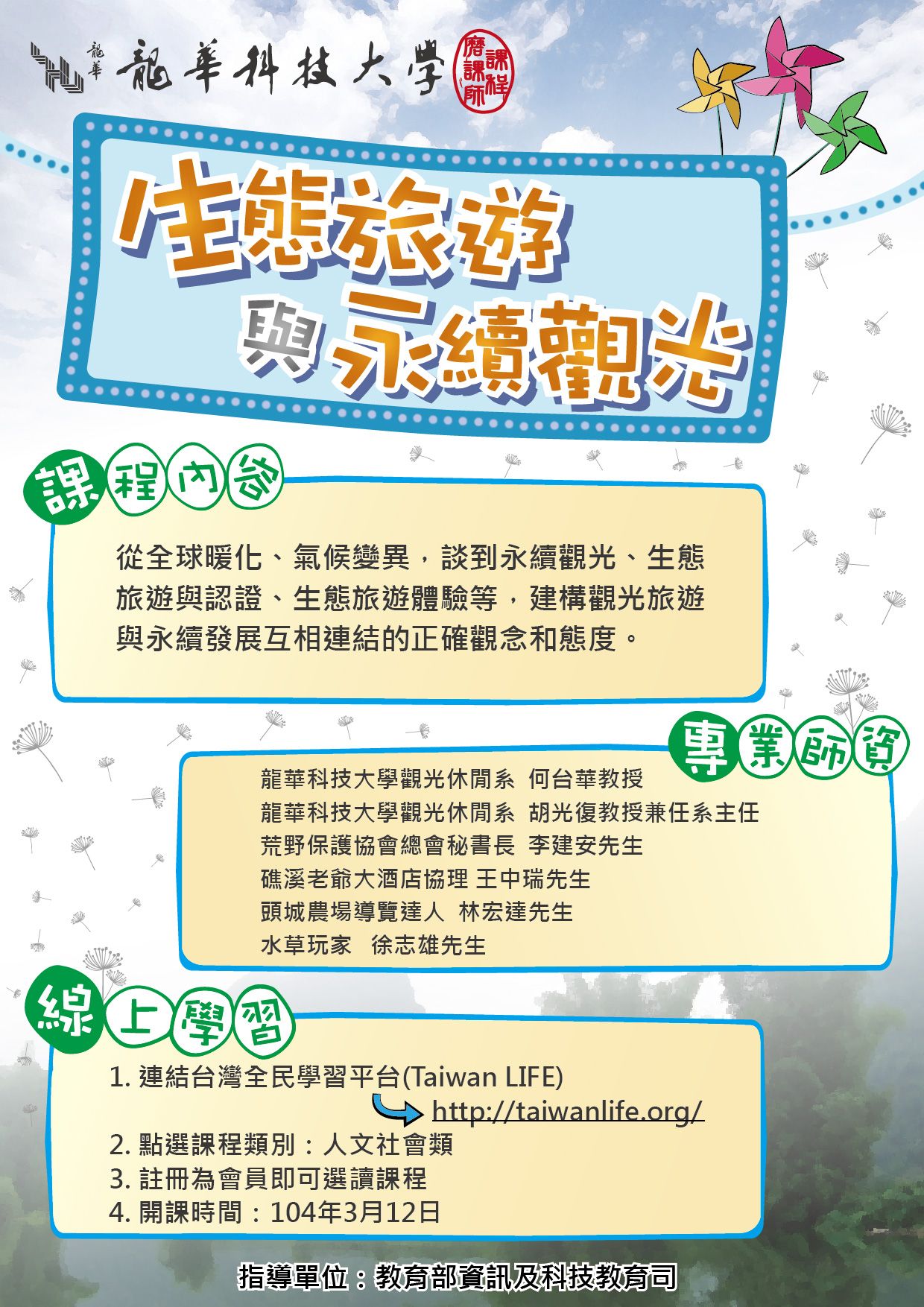 | 2015/03/18 龍華科技大學磨課師線上課程「生態旅遊與永續觀光」即日起免費開放報名 |