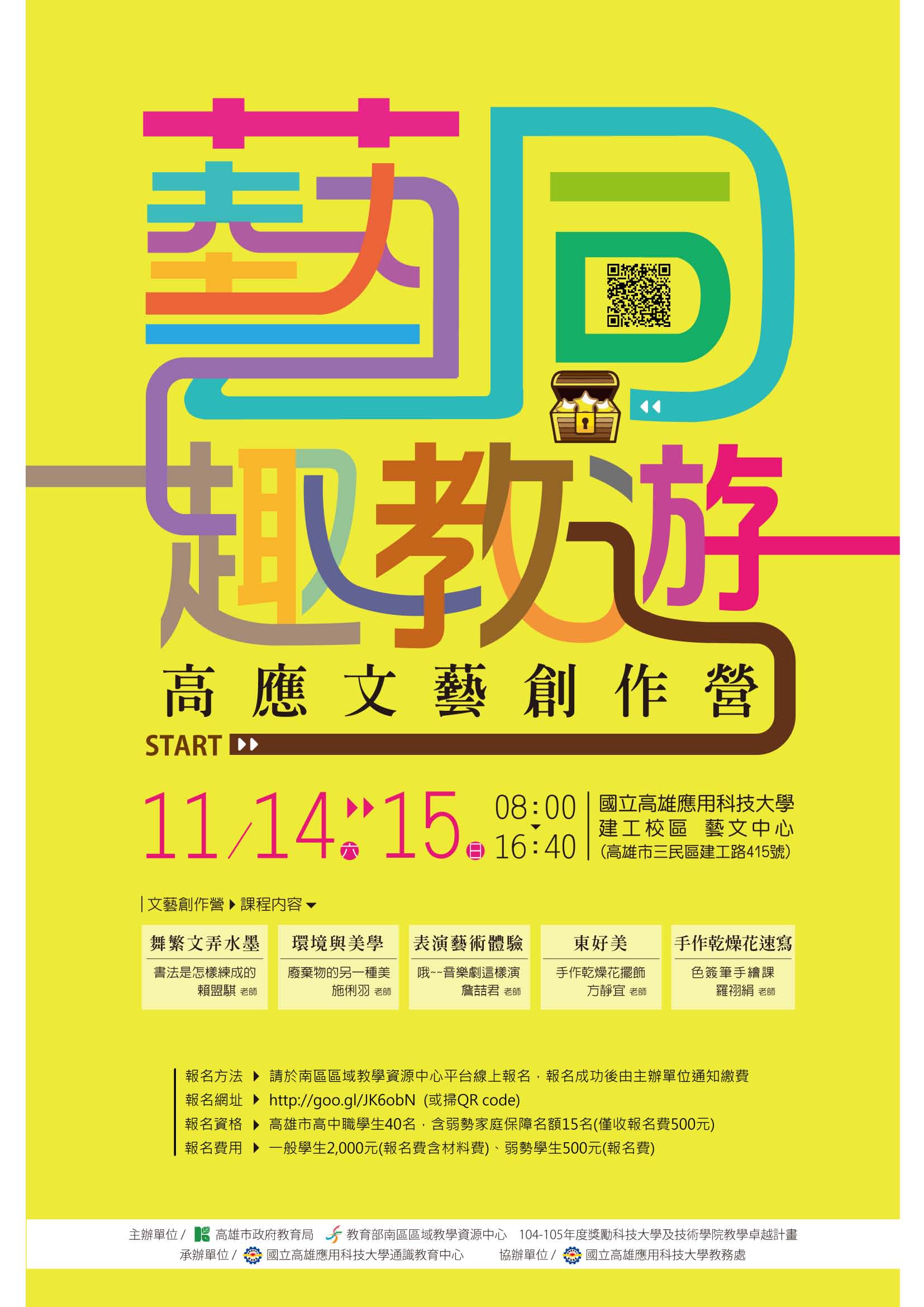 教育部南區區區域教學資源中心、國立高雄應用大學與本局共同辦理「高雄市2015高中職學生-Maker Movement科學營」與「藝同趣教遊-高應文藝創作營」2場活動