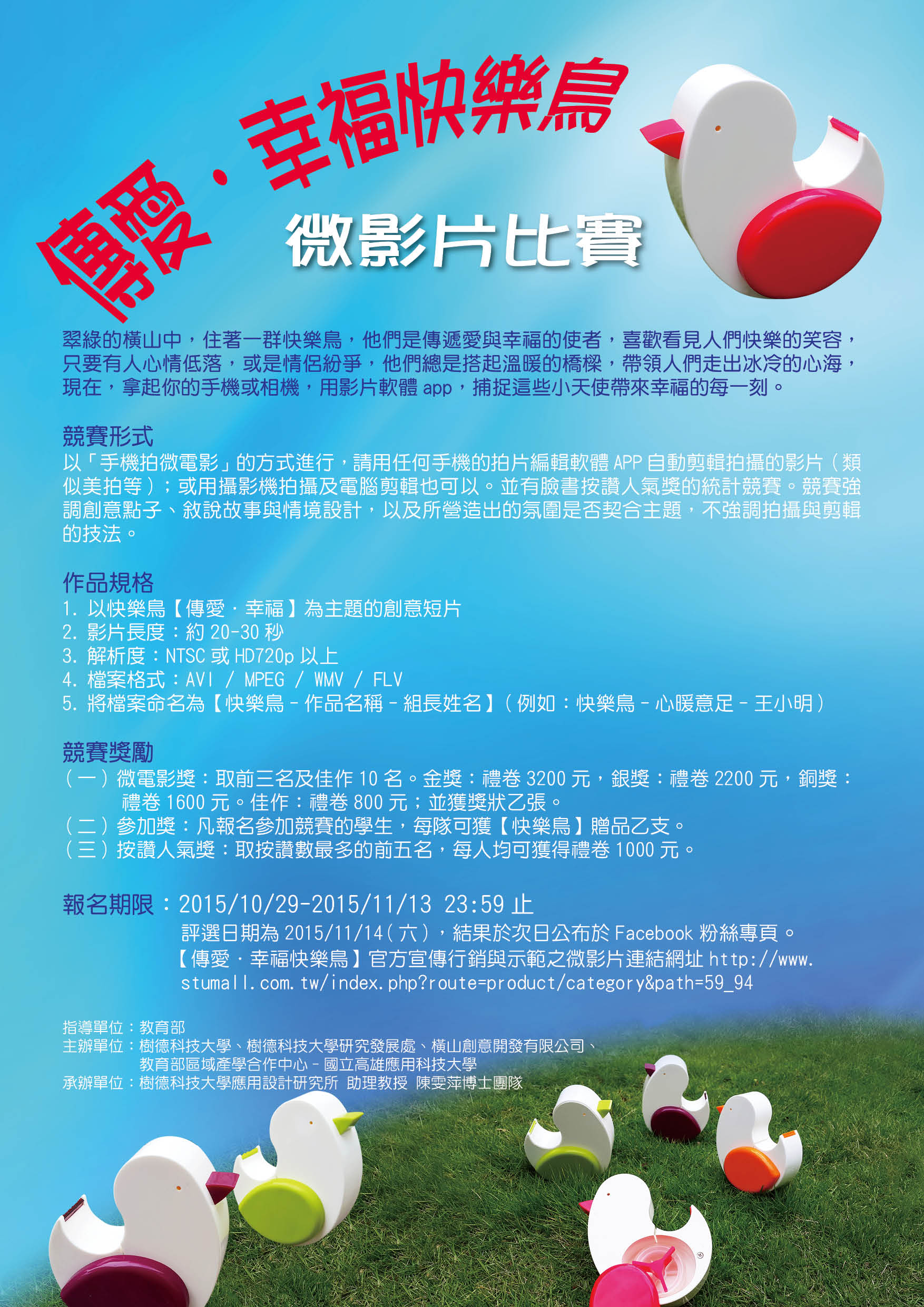 | 2015/11/05 樹德科技大學校辦理『「傳愛。幸福快樂鳥」微影片徵集比賽』,請踴躍參加。 |