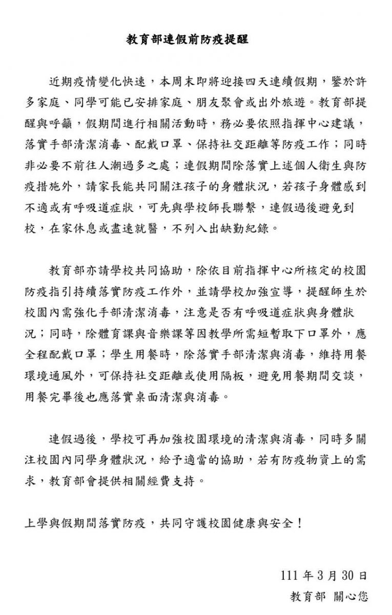 | 2022/03/31 [防疫資訊]教育部連假前防疫提醒 |