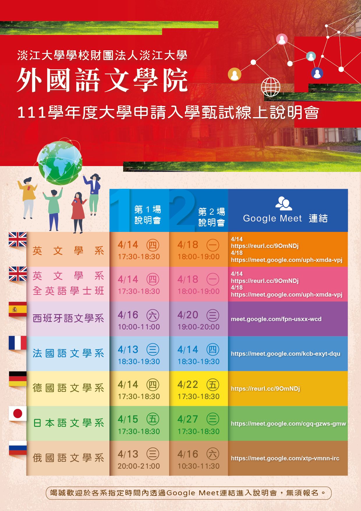 淡江大學外國語文學院所屬各學系「111學年度大學申請入學甄試線上說明會」海報