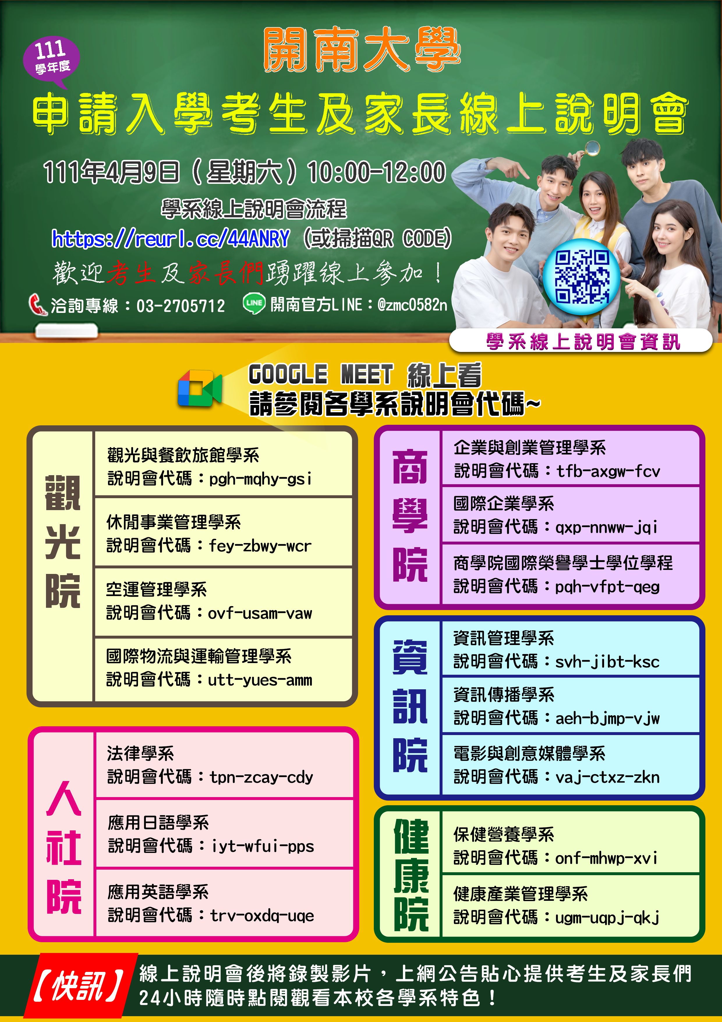 一、原訂111年4月9日(星期六)上午10時至12時辦理「111學年度大學申請入學考生及家長說明會」,因疫情改為「線上說明會」,詳情請參閱開南大學招生處網頁公告(網址:https://reurl.cc/44ANRY)。