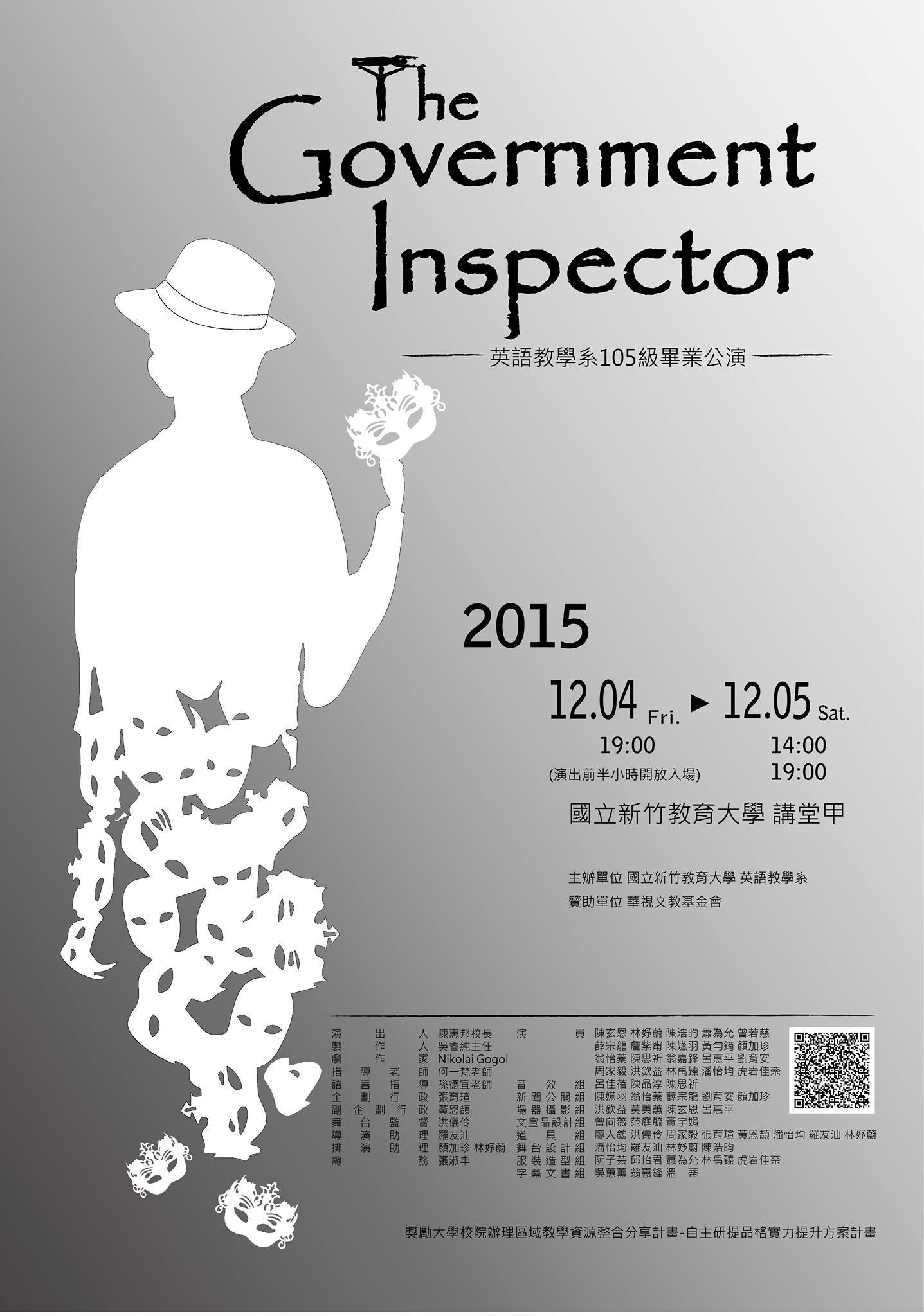 | 2015/11/09 新竹教育大學將舉辦「105級畢業公演- The Government Inspector」,請踴躍參加。 |