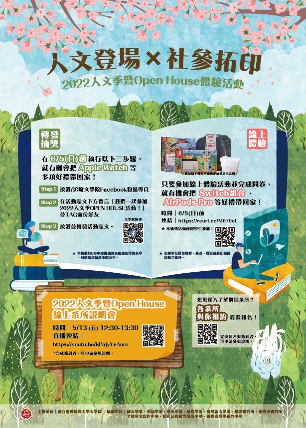臺灣師範大學文學院訂於111年5月13日(星期五)辦理「2022人文季暨OPEN HOUSE線上系所體驗活動」