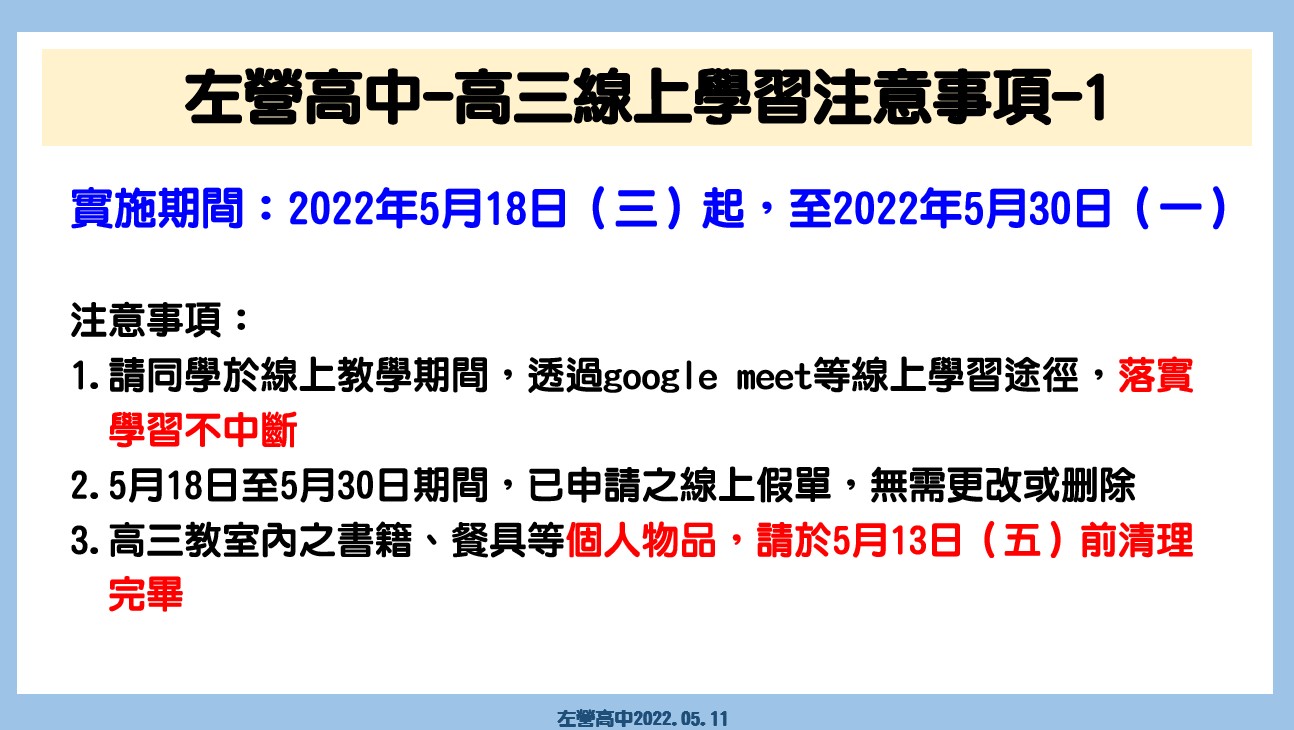 | 2022/05/11 有關高三學生5月18日至5月30日線上學習注意事項 |