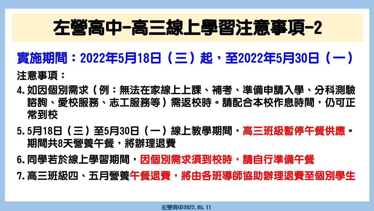 5.5月18日(三)至5月30日(一)線上教學期間,高三班級暫停午餐供應。期間共8天營養午餐,將辦理退費。