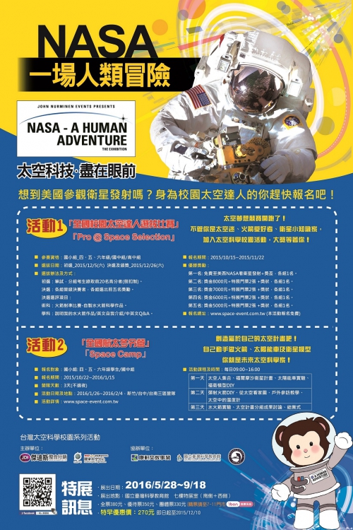 - 活動FB粉絲團: https://www.facebook.com/nasa.exhibition.taiwan/ 或FB搜尋”NASA-一場人類冒險”