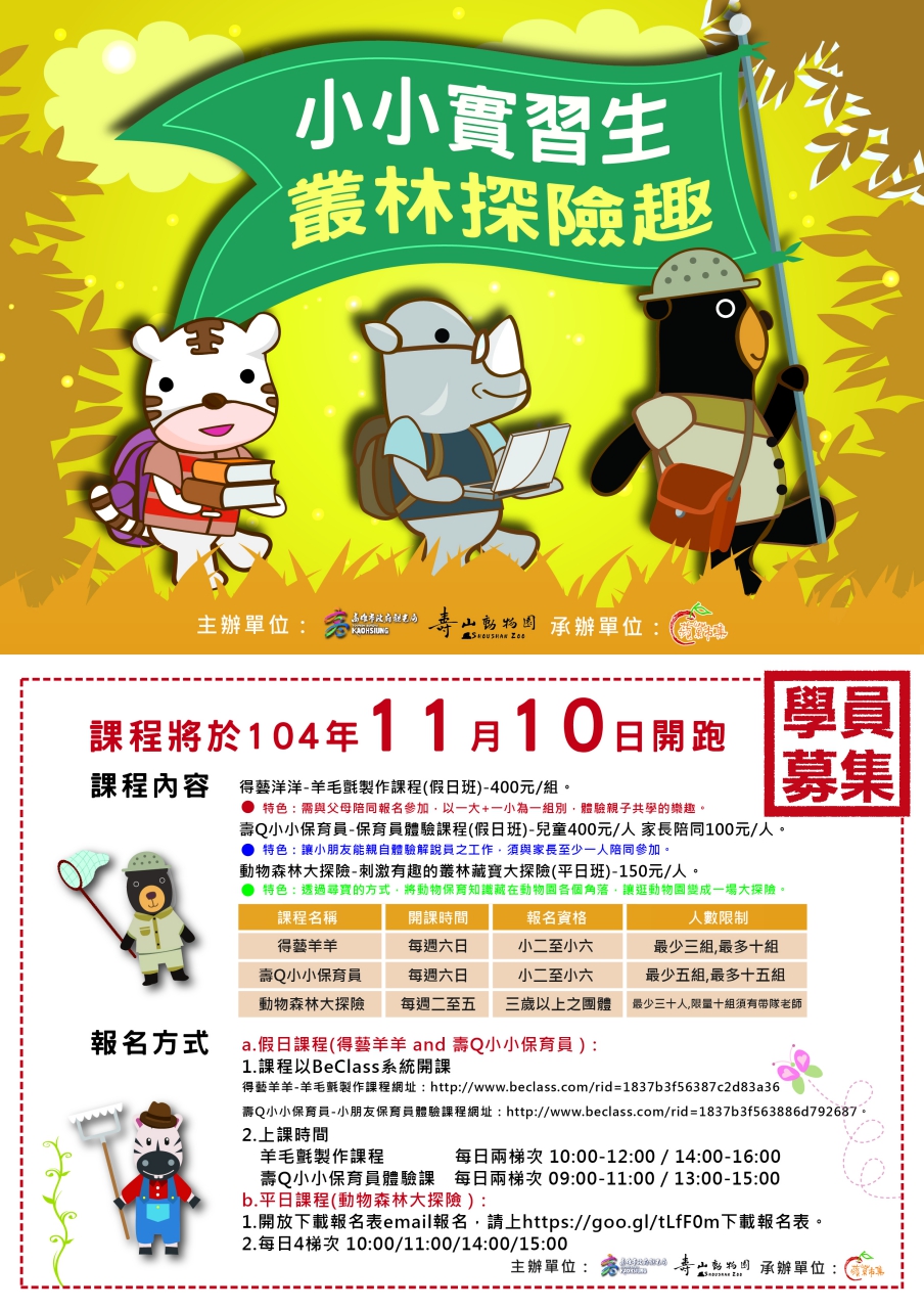 | 2015/11/11 壽山動物園舉辦「小小實習生」叢林探險趣課程活動,請踴躍參加。 |