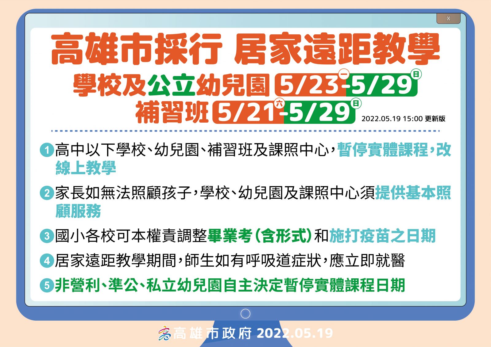 1.依據高雄市111年5月19日防疫記者會公告事項辦理。