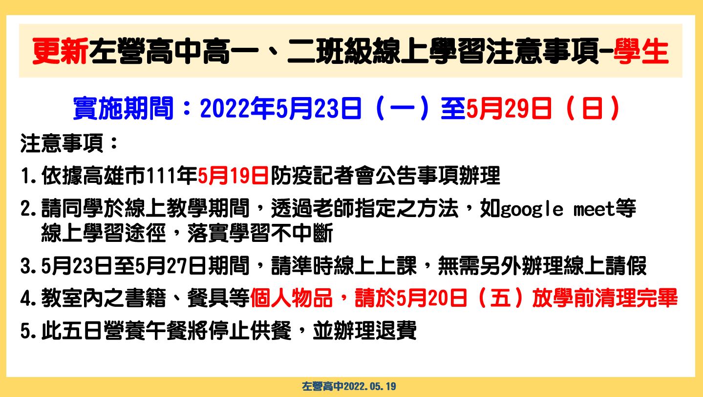 | 2022/05/18 [重要資訊]高一、二學生5月23日(一)至5月29日(日)線上學習注意事項,請務必詳細參考 |