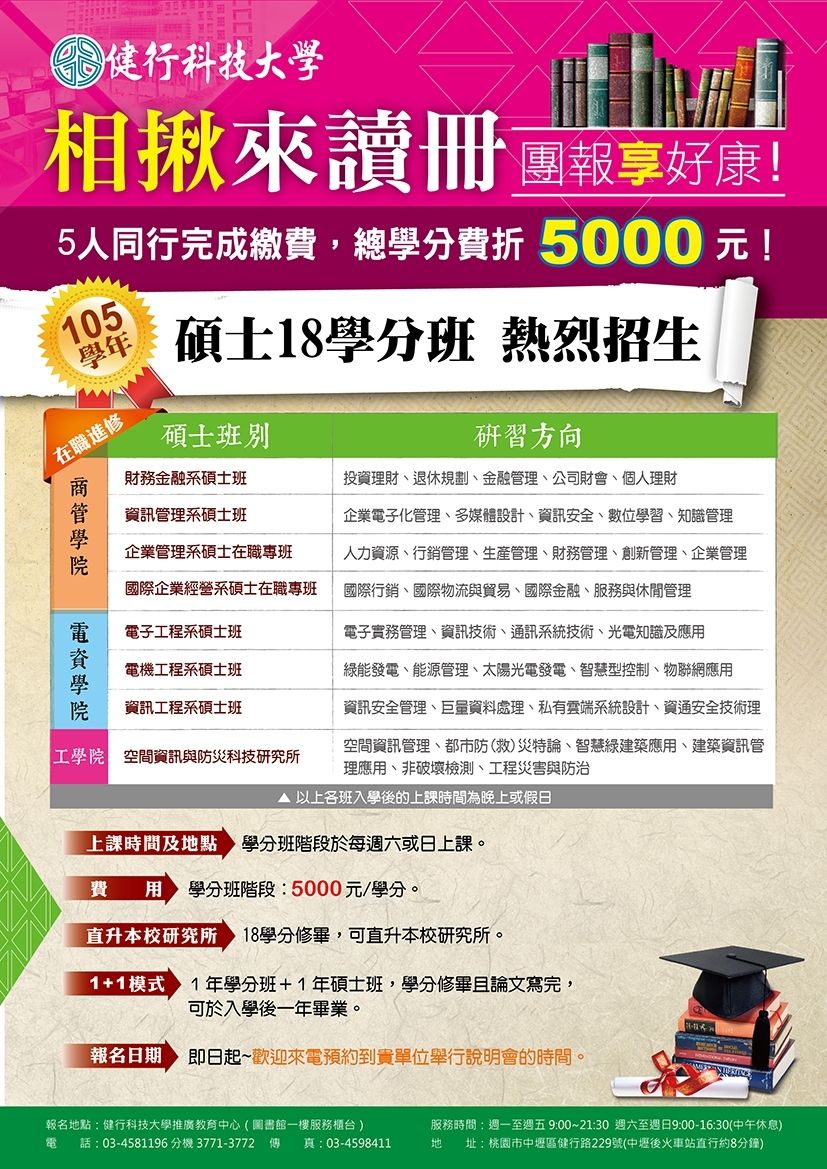 | 2015/11/12 健行科技大學推廣教育中心105學年度「碩士學分班」招生 |