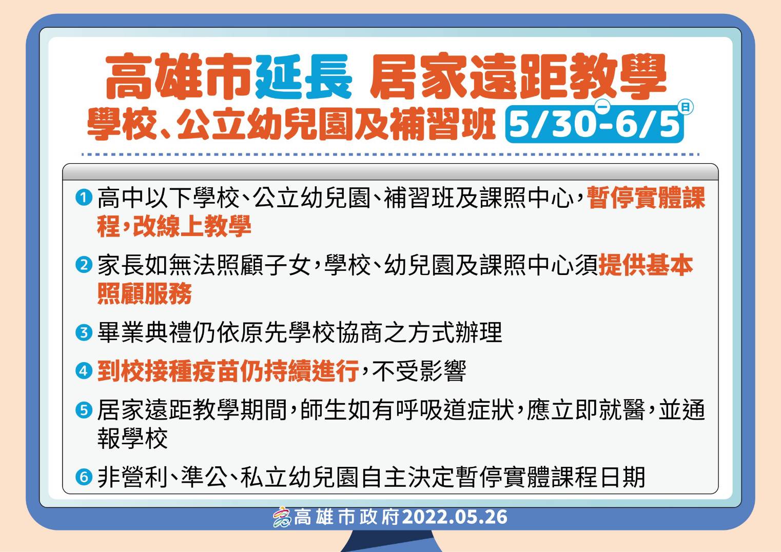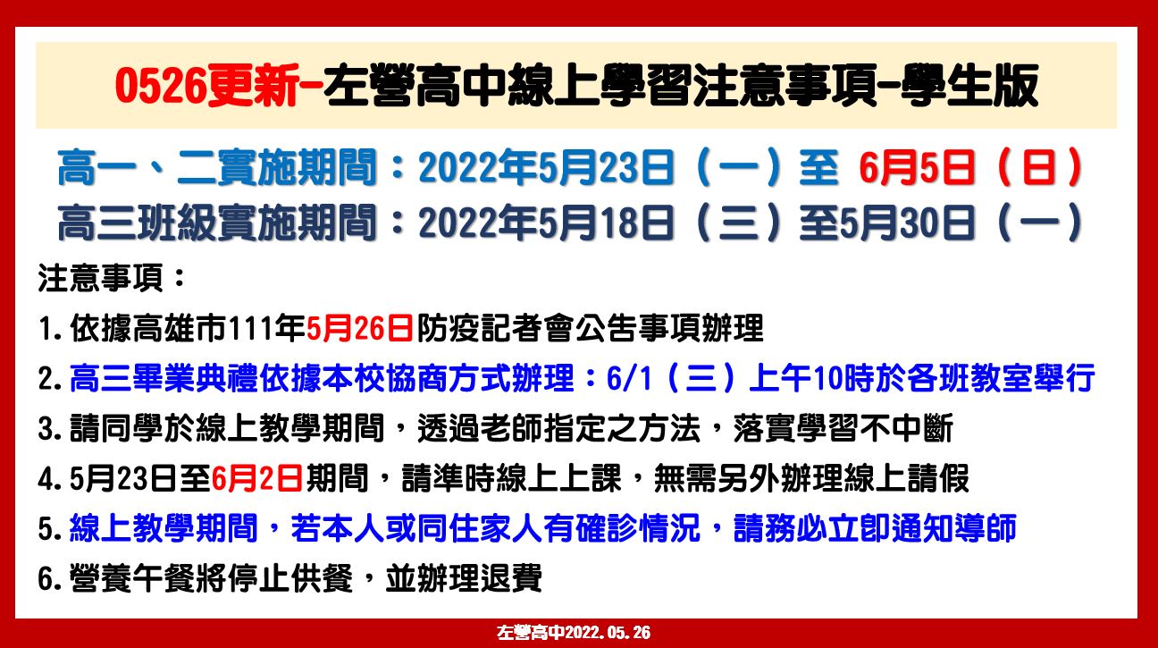 1.依據高雄市111年5月26日防疫記者會公告事項辦理。
