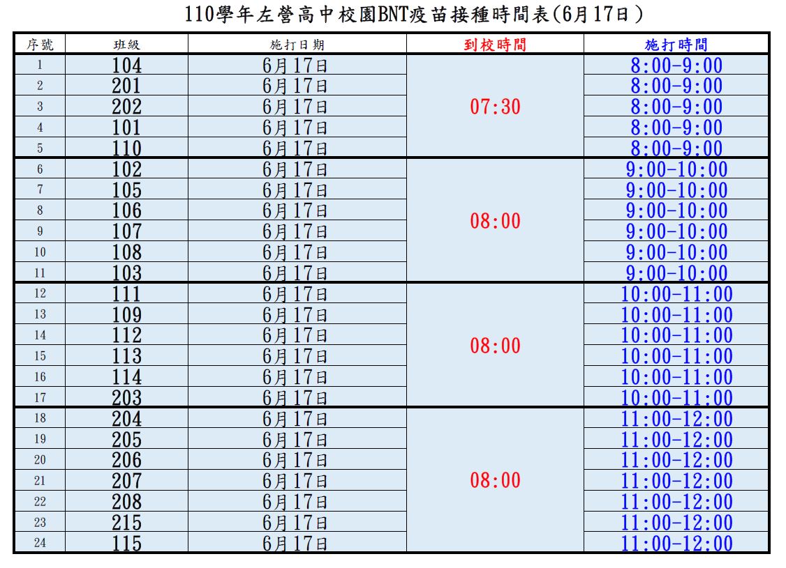 - 接種地點為圖書館;各班到校時間與接種時間表請參考下圖;