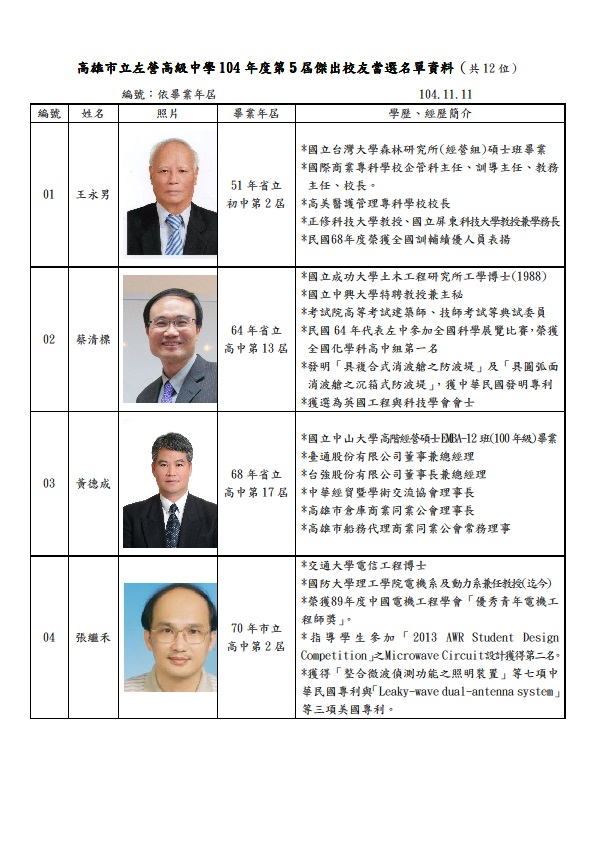 本校第五屆傑出校友遴選委員會於11月11日星期三下午召開,共有12位傑出校友當選,大家一起恭喜及歡迎左中傑出校友!