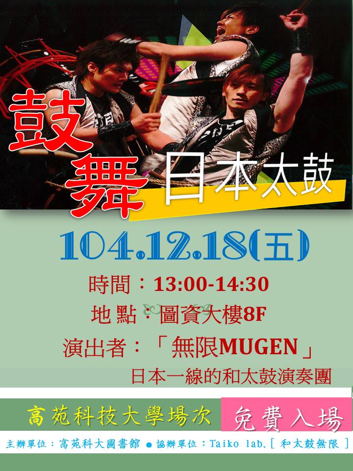 | 2015/11/24 高苑科技大學邀請日本知名「『無限MUGEN』和太鼓創作演奏團」到校演出,請踴躍參加。 |